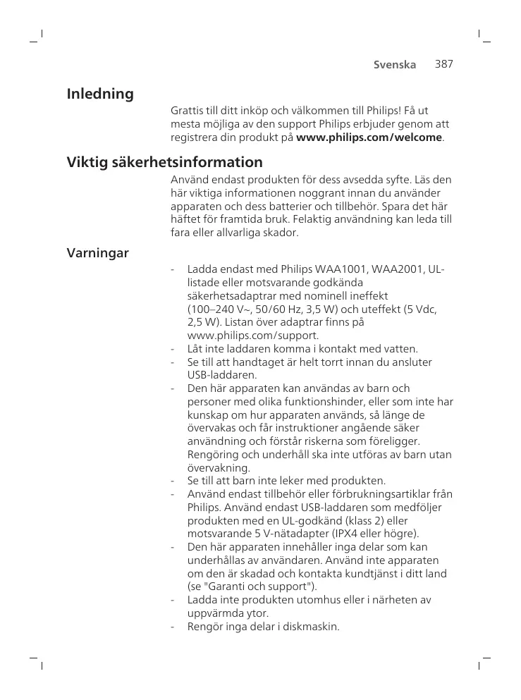 - Utilisez exclusivement des accessoires ou des consommables de la marque Philips. Utilisez uniquement le chargeur USB fourni avec le produit avec un adaptateur SV CC (IPX4 ou supérieur) homologué UL (classe 2) ou équivalent.