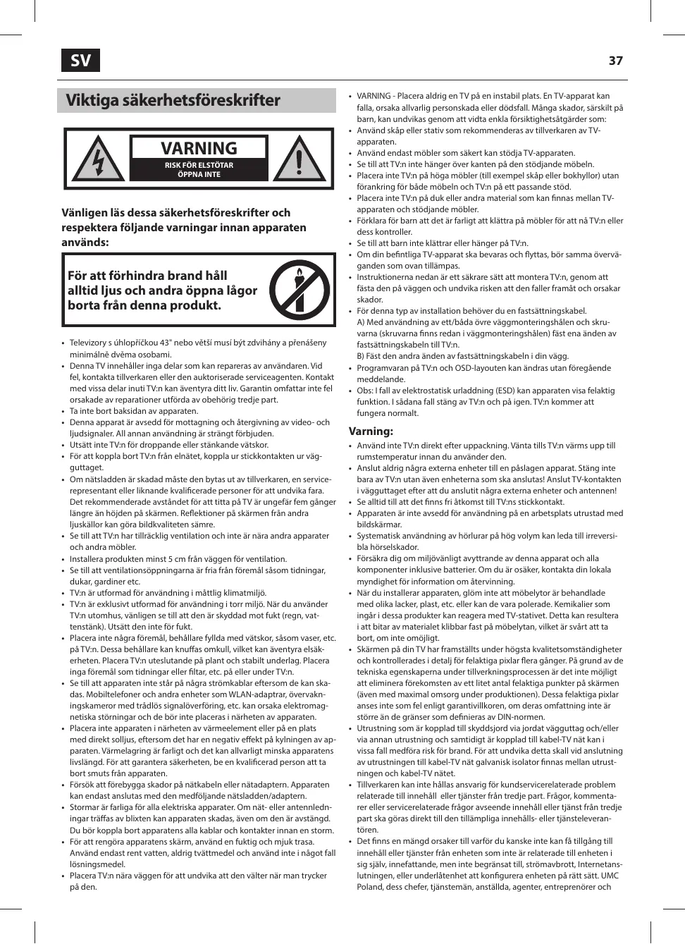 + Cette TV ne contient aucune pièce qui pourrait être réparée par l'utilisateur. En cas de défaut, contacter le fabricant ou l'agent autorisé qui assure le service après-vente. Le contact avec certaines parties stu- es à l'intérieur de la TV pourrait mettre votre vie en danger. La garantie ne couvre pas les défauts provoqués par des réparations effectuées par des tiers non autorisés.