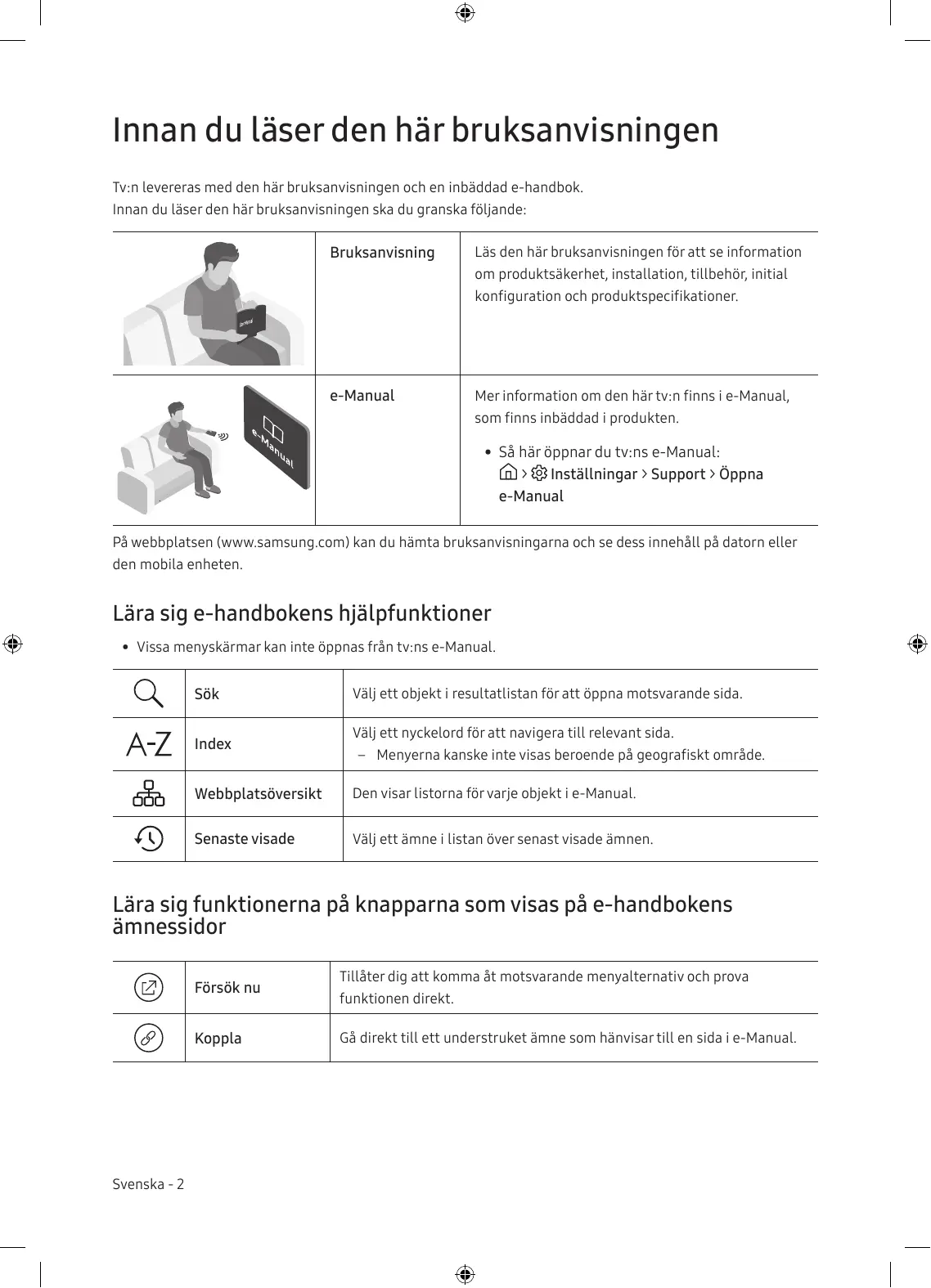+ Sà här ôppnar du tv:ns e-Manual: @ > & Inställningar > Support > Üppna e-Manual