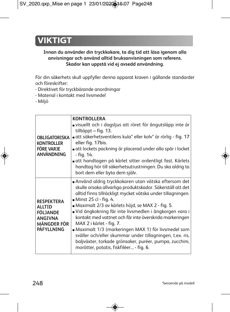 Innan du använder din tryckkokare, ta dig tid at läsa igenom alla anvisningar och använd alltid bruksanvisningen som referens. Skador kan uppstä vid ej avsedd användning.