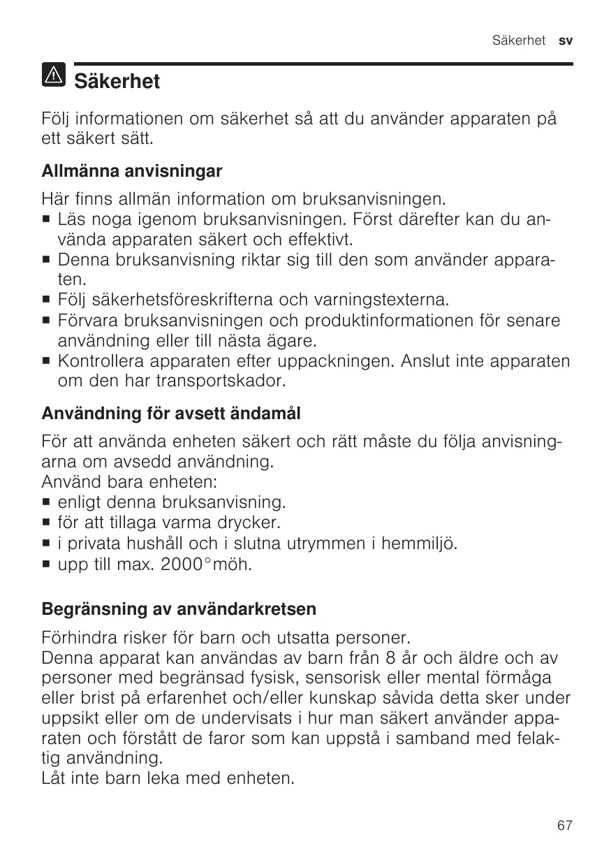 À VARNING - Risk fôr personskador! En felaktig användning av apparaten kan utsätta användaren fr risker. > Använd endast apparaten ändamälsenligt.