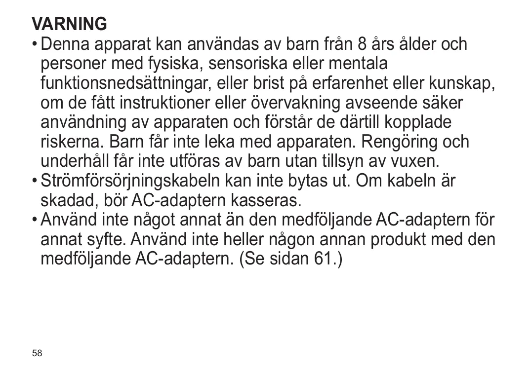 + Ne pas utiliser autre chose que l'adaptateur CA fourni pour quelque usage que ce soit. Et ne pas utiliser un autre produit