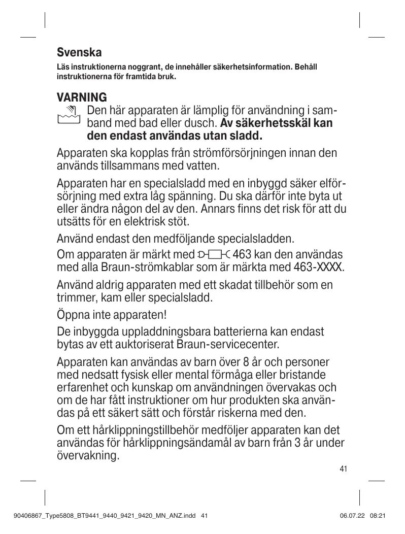 Om apparaten är märkt med D} 463 kan den användas med alla Braun-strômkablar som är märkta med 463-XXXX.