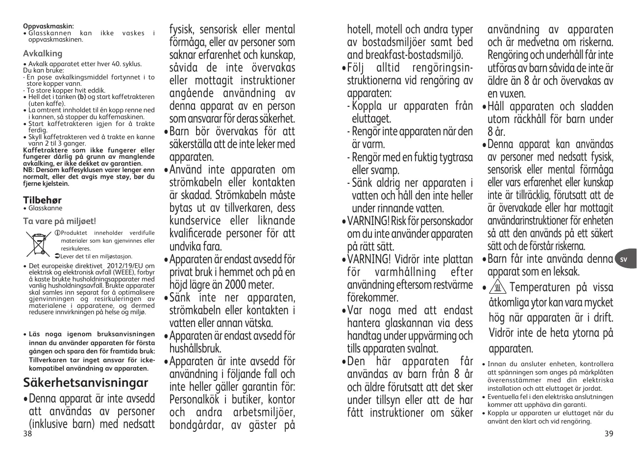 Oppvaskmaskin: -Glasskannen kan ikke vaskes à oppvaskmaskinen. Avkalking + Avkalk apparatet etter hver 40. syklus. Du kan bruke: En pose avkalkingsmiddel fortynnet i to store kopper vann. To store kopper hvit eddik. + Hell det i tanken (b) og start kaffetrakteren uten kaffe). + La omtrent innholdet til én kopp renne ned i kannen, sà stopper du kaffemaskinen. + Start kaffetrakteren igjen for à trakte ferdig + Skyll Kaffetrakteren ved à trakte en kanne vann 2 til 3 ganger. Kaffetraktere som ikke fungerer eller fungerer darlig pâ grunn av manglende avkalking, er ikke dekket av garantien. NB: Dersom kaffesyklusen varer lenger enn normait, eller det avgis mye stoy, bor du fjerne kjelstein. Tilbehor + Glasskanne Ta vare pà miljoet! @ŒProduktet _inneholder _verdifulle materialer som kan gjenvinnes eller resikuleres. laver det ti en mijostasjon. + Det europeiske direktivet2012/19/EU om elektrisk 0g elektronisk avfall (WEEE), forbyr à kaste brukte husholdninasapparater med vanlig husholdningsavfall. Brukte apparater Skal samles inn separat for à optimalisere gienvinningen og resirkuleringen av materialene i apparatene, og dermed redusere innvirkningen pà else og mil. + Läs noga igenom bruksanvisningen innan du använder apparaten fôr fôrsta gängen och spara den fôr framtida bruk: Tiliverkaren tar inget ansvar fôr icke- kompatibel användning av apparaten. Säkerhetsanvisningar +Denna apparat är inte avsedd att användas av personer (inklusive barn) med nedsatt fysisk, sensorisk eller mental f6rmäga, eller av personer som saknar erfarenhet och kunskap, sävida de inte ôvervakas eller mottagit instruktioner angäende användning av denna apparat av en person som ansvarar fôr deras säkerhet. eBarn bôr ôvervakas für att säkerställa att de inte leker med apparaten. eAnvänd inte apparaten om strômkabeln eller kontakten är skadad. Strômkabeln mâste bytas ut av tillverkaren, dess kundservice eller liknande kvalificerade personer für att undvika fara. < Apparaten är endast avsedd fôr privat bruk hemmet och pà en hôjd lägre än 2000 meter. +Sänk inte ner apparaten, strômkabeln eller kontakten i vatten eller annan vätska. < Apparaten är endast avsedd fôr hushällsbruk. eApparaten är inte avsedd für användning i füljande fall och inte heller gäller garantin for: Personalkôk i butiker, kontor och andra arbetsmiljôer, bondgärdar, av gäster pà hotell, motell och andra typer av bostadsmiljéer samt bed and breakfast-bostadsmiljô. eFôlj alltid rengôringsin- struktionerna vid rengôring av apparaten: -Koppla ur apparaten frän eluttaget. - Rengôr inte apparaten när den ür varm. - Rengôr med en fuktig tygtrasa eller svamp. -Sänk aldrig ner apparaten i vatten och häll den inte heller under rinnande vatten. < VARNINGI Risk für personskador om du inte använder apparaten pa rt sätt. + VARNING! Vidrôr inte plattan for varmhällning efter användning eftersom restvärme fôrekommer. Var noga med att endast hantera glaskannan via dess handtag under uppvärming och tills apparaten svalnat. eDen hür apparaten für användas av barn frän 8 àr och äldre férutsatt att det sker under tillsyn eller att de har fätt_instruktioner om säker användning av apparaten och är medvetna om riskerna. Rengôring och underhäll far inte utfôras av barn sävida de inte är äldre än 8 àr och ôvervakas av en vuxen. Häll apparaten och sladden utom räckhäll fôr barn under 8 r. eDenna apparat kan användas av personer med nedsatt fysisk, sensorisk eller mental fôrmäga eller vars erfarenhet eller kunskap inte ür tillräcklig, fôrutsatt att de ür ôvervakade eller har mottagit användarinstruktioner für enheten sà att den används pà ett sûkert sâtt och de forstär riskerna. *Barn für inte använda denna € apparat som en leksak. + A\ Temperaturen pà vissa ätkomliga ytor kan vara mycket hôg nûr apparaten àr i drift. Vidrôr inte de heta ytorna pà apparaten. + Innan du ansluter enheten, kontrollera att spänningen som anges pâ märkpläten éverensstämmer med din elektriska installation och att eluttaget är jordat. + Eventuella el i den elektriska anslutningen kommer att upphäva din garanti + Koppla ur apparaten ur eluttaget när du använt den klart och vid rengôring,