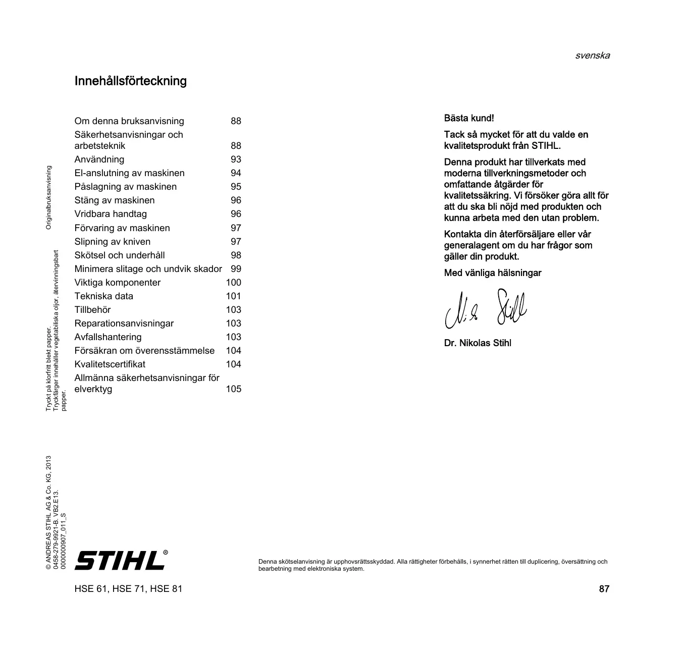 svenska Bästa kund! Tack sä mycket fôr att du valde en kvalitetsprodukt frän STIHL. Denna produkt har tillverkats med moderna tillverkningsmetoder och omfattande ätgärder für kvalitetssäkring. Vi fôrsôker gôra alit für att du ska bli nôjd med produkten och kunna arbeta med den utan problem. Kontakta din âterfôrsäljare eller vär generalagent om du har frägor som gäller din produkt. Med vänliga hälsningar