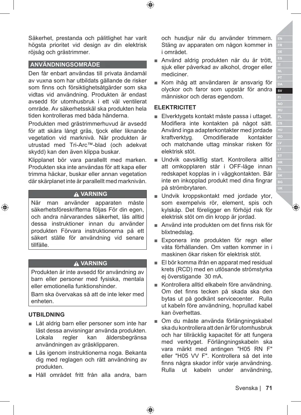 UTILISATION PRÉVUE La coupe-bordures et débrousailleuse électrique doit être utilisée seulement par des adultes ayant lu et compris les instructions et les avertissements inclus dans le présent manuel et pouvant être considérés comme responsables de leurs actes. Ce produit ne doit être utilisé qu'à l'extérieur dans une zone bien ventilée. Pour des raisons de sécurité, l'appareil doit être manipulé de manière appropriée, en utilisant les deux mains.