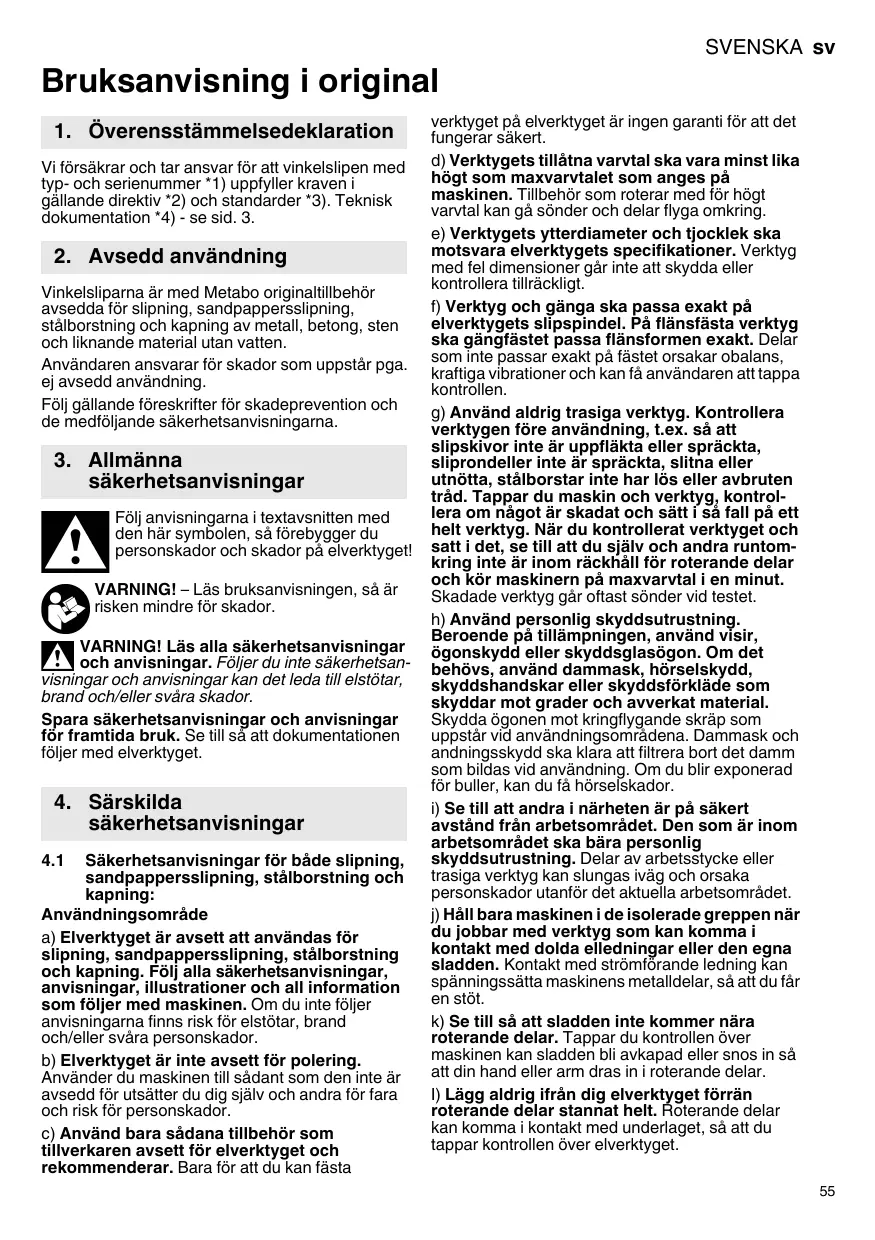 BRUKSANVISNING W 1100-115 W 1100-125 W 1150-125 WP 1200-115 RT WP 1200-125 RT WE 1500-125 RT WE 1500-150 RT WEV 1500-125 RT WEV 1500-125 Quick RT METABO