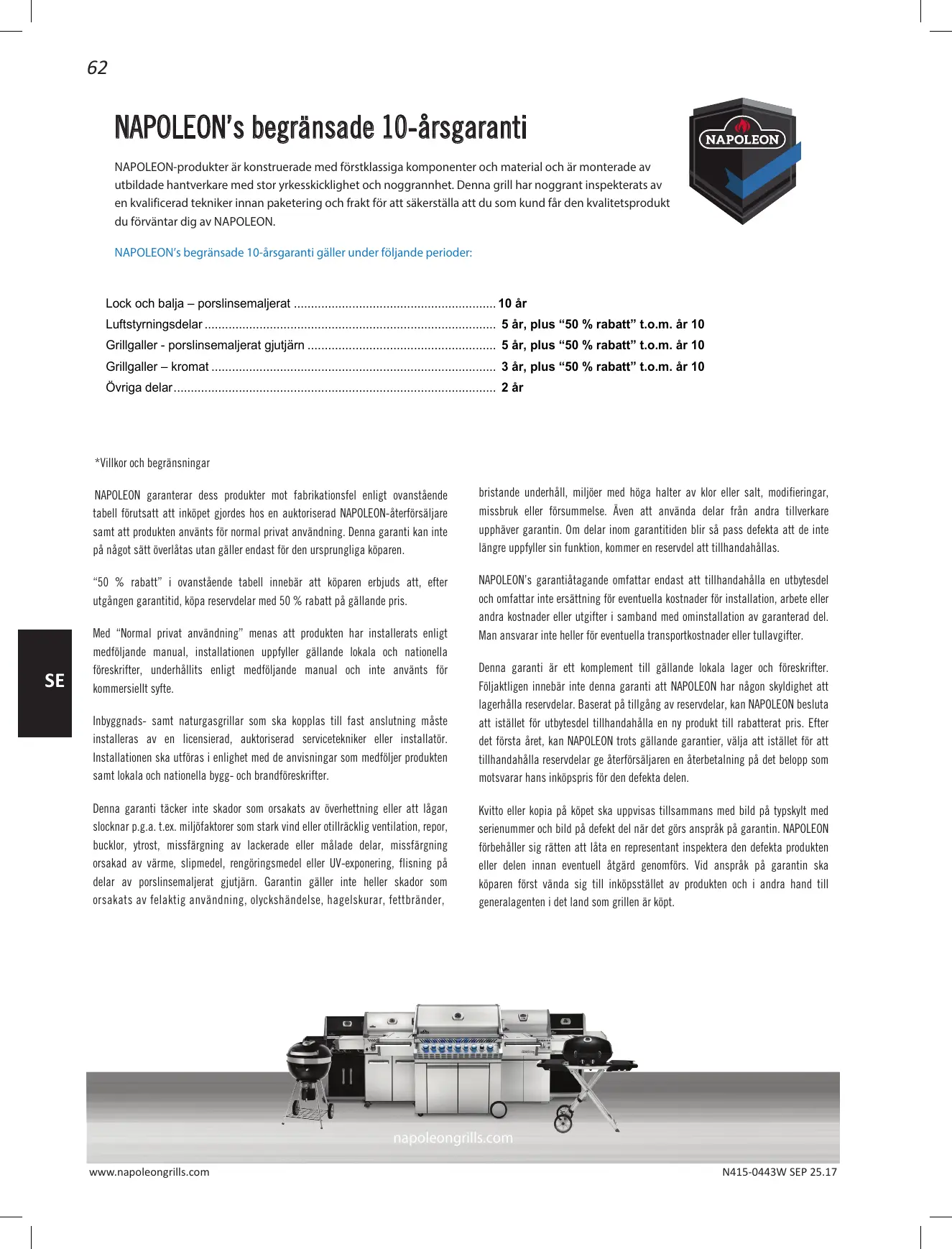 NAPOLEON's begränsade 10-ârsgaranti NAPOLEON-produkter är konstruerade med fôrstklassiga komponenter och material och är monterade av utbildade hantverkare med stor yrkesskicklighet och noggrannhet. Denna grill har noggrant inspekterats av en kvalificerad tekniker innan paketering och frakt fôr att säkerställa att du som kund fàr den kvalitetsprodukt du fôrväntar dig av NAPOLEON. NAPOLEON'5 begränsade 10-ärsgaranti gäller under féljande perioder: Lock och balja — porslinsemaljerat … Luftstyrningsdelar Grillgaller - porslinsemaljerat gjutjämn … Grillgaller — kromat . Ôvriga delar… AYillor och begränsningar NAPOLEON garanterar des produkter mot fabrikationsfel enligt ovanstéende tabell fürutsatt att inkôpet gjordes hos en auktoriserad NAPOLEON-éterfürsäljare samt att produkten använts für normal privat användning. Denna garanti kan inte pà nâgot sätt ôverlätas utan gäller endast für den ursprungliga kôparen “50 % rabatt” à ovanstéende tabell innebär att kparen erbjuds at, efter utgängen garantitid, Kôpa reservdelar med 50 % rabatt pà gällande pris. Med “Normal privat användning” menas att produkten har installerats enligt medfôljande manual, installationen uppfyler gällande lokala och_nationella fôreskrifter,underhällits enligt medfôljande manual ochinte_använts for kommersielt syfte. Inbyggnads- samt naturgasgrillar som ska kopplas til fast anslutning mâste installeras av en licensierad, auktoriserad senvicetekniker eller installatôr. Installationen ska utfôras i enlighet med de anvisningar som medféler produkten samt okala oct nationella bygg- och brandfôreskrifer. Denna garanti täcker inte skador som orsakats av ôverhettning eller att Làgan slocknar p.8.2. Lex. miljôfaktorer som stark vind eller otilräcklig ventilation, repor, bucklor, ytrost, missfärgning av lackerade eller mâlade delar, missfärgning orsakad av värme, slipmedel, rengôringsmedel eller UV-euponering, lisning pà delar av porslinsemaljerat gjutjäm. Garantin gâller inte heller skador som orsakats av felaktig användning, olyckshändelse, hagelskurar, fettbränder, 10 är 5 àr, plus “50 % rabatt” t.o.m. är 10 5 àr, plus “50 % rabatt” t.o.m. är 10 3 àr, plus “50 % rabatt” t.o.m. är 10 2är bristande underhäll, miler med hôga halter av Mor eller sait, modifiringar, missbruk eller fôrsummelse. Âven att använda delar frän andra tilverkare upphäver garantin. Om delar inom garantitiden blir sä pass defekta att de inte längre uppfyller sin funktion, kommer en reservdel at tilhandahällas. NAPOLEON's garantiätagande omfattar endast att tillhandahälla en utbytesdel och omfattar inte ersättning für eventuella kostnader für installation, arbete eller andra kostnader eller utgifter i samband med ominstallation av garanterad del Man ansvarar inte heller für eventuella transportkostnader eller tullavgifter. Denna garanti är ett komplement til gâllande lokala lager och füreskrifter. Füljakligen innebär inte denna garanti att NAPOLEON har nâgon skyldighet att lagerhälla reservdelar. Baserat pâ tillgäng av reservdelar, kan NAPOLEON besluta att istället für utbytesdel tilhandahâlla en ny produkt til rabatterat pris. Efter det fürsta âret, kan NAPOLEON trots gâllande garanter, välja at istället fôr att tilhandahälla reservdelar ge âterfôrsäljaren en âterbetalning pâ det belopp som motsvarar hans inkôpspris fôr den defekta delen. Hvitto eller kopia pà kpet ska uppvisas tillsammans med bild pâ typskyit med serienummer och bild pâ defekt del när det gôrs ansprâk pâ garantin. NAPOLEON fôrbehäller sig râtten attlâta en representant inspektera den defekta produkten eller delen innan eventuell ätgärd genomfôrs. Vid anspräk pâ garantin ska Küparen fôrst vända sig till inkôpsstället av produkten och à andra hand till generalagenten i det land som grillen är küpt. www.napoleongrills.com