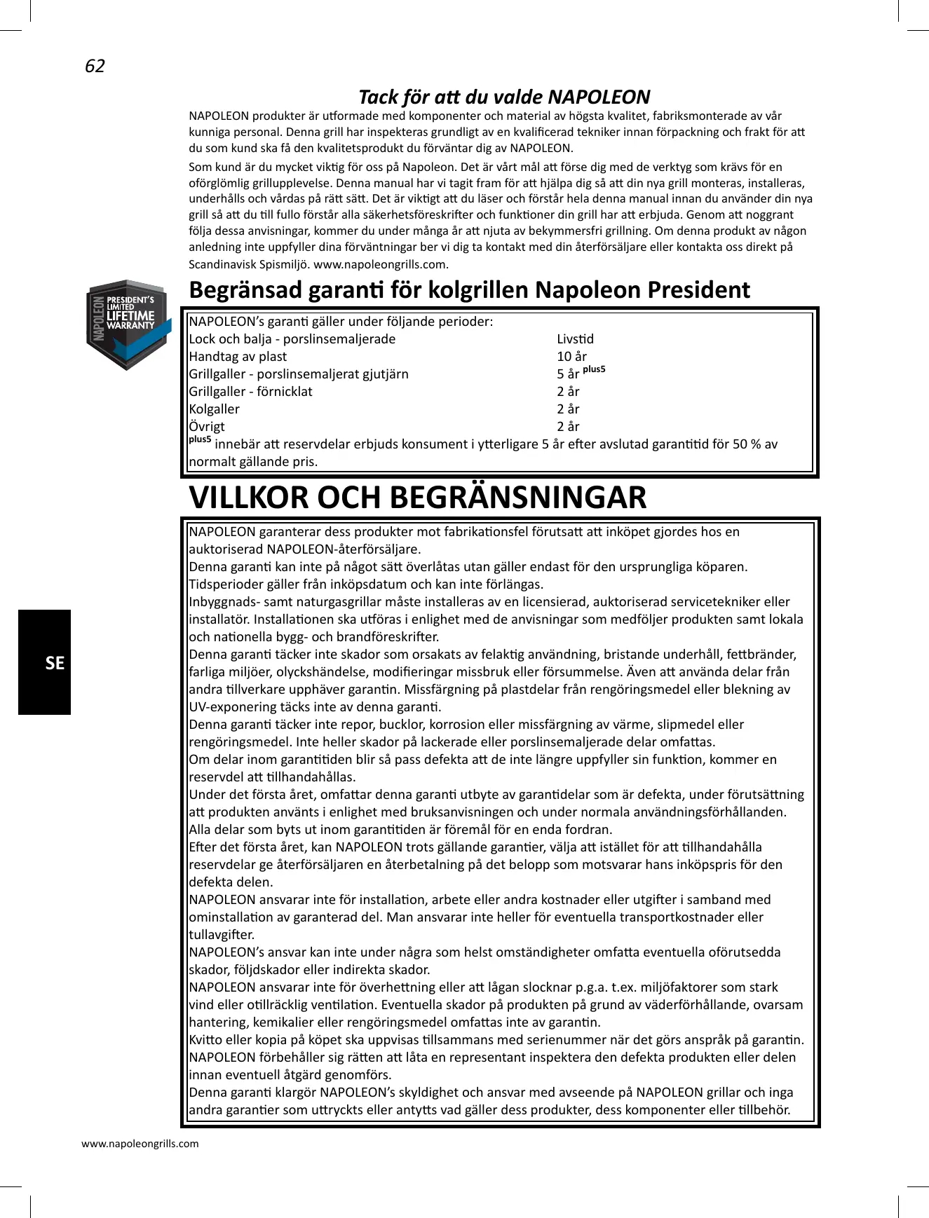 WARRANTY Tack fôr att du valde NAPOLEON NAPOLEON produkter är utformade med komponenter och material av hôgsta kvalitet, fabriksmonterade av vär kunniga personal. Denna grill har inspekteras grundligt av en kvalificerad tekniker innan fôrpackning och frakt fôr att du som kund ska fà den kvalitetsprodukt du fôrväntar dig av NAPOLEON. Som kund är du mycket viktig fôr oss pä Napoleon. Det är värt mäl att fôrse dig med de verktyg som krävs fôr en oférglômlig grillupplevelse. Denna manual har vi tagit fram fôr att hjälpa dig sà att din nya grill monteras, installeras, underhälls och värdas pà rätt sätt. Det är viktigt att du läser och fürstär hela denna manual innan du använder din nya grill sä att du till fullo frstär alla säkerhetsfôreskrifter och funktioner din grill har att erbjuda. Genom att noggrant fôlja dessa anvisningar, kommer du under mänga är att njuta av bekymmersfri grillning. Om denna produkt av nägon anledning inte uppfyller dina fôrväntningar ber vi dig ta kontakt med din äterfôrsäljare eller kontakta oss direkt pà Scandinavisk Spismiljô. www.napoleongrills.com.