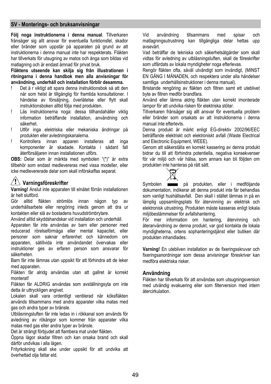 Varning! Gër alltid fläkten strômlës innan nâgon typ av underhällsarbete eller rengëring inleds genom att slà ifrân bostadens huvudstrômbrytare.