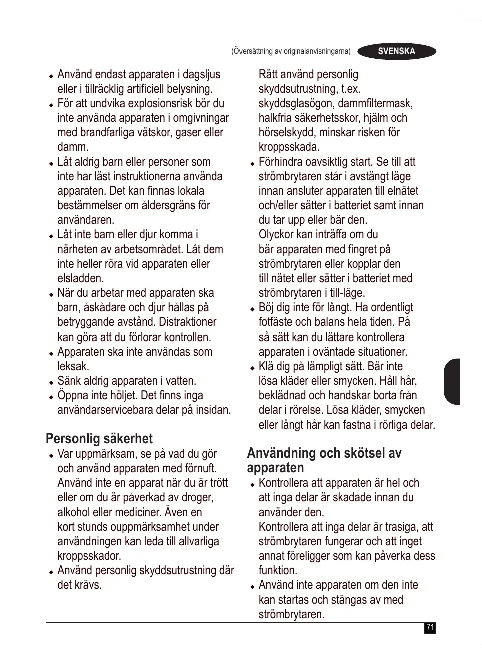 + Pour protéger vos pieds et vos jambes quand l'appareil est en marche, portez toujours des chaussures renforcées et un pantalon.