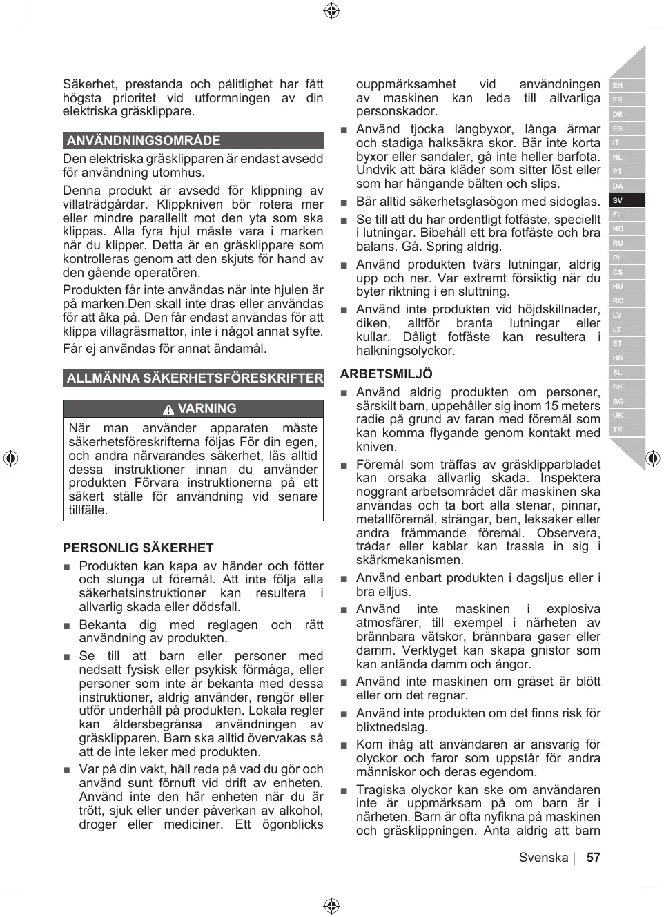 = La tondeuse à gazon est capable d'amputer les mains et les pieds, ainsi que de projeter des objets. Le non-respect de toutes les règles de sécurité est susceptible d'entraîner des blessures graves voire mortelles.