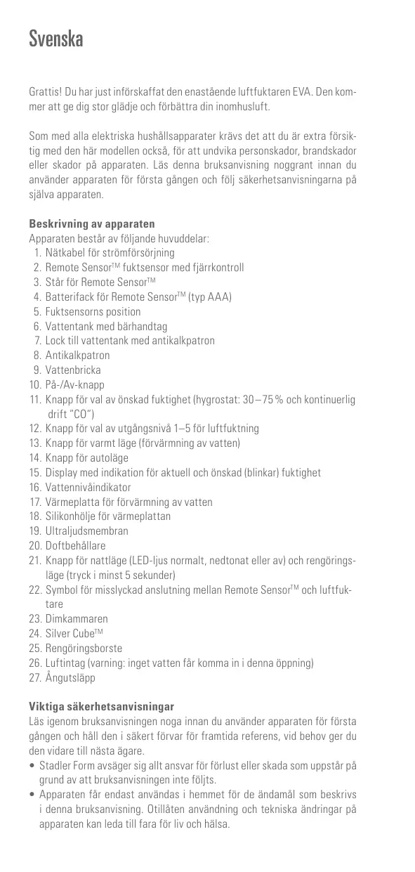 Viktiga säkerhetsanvisningar Läs igenom bruksanvisningen noga innan du använder apparaten für fürsta gängen och hâll den i säkert fürvar für framtida referens, vid behov ger du den vidare till nästa ägare. + Stadler Form avsäger sig alt ansvar for fôrlust eller skada som uppstär pà grund av att bruksanvisningen inte füljts + Apparaten fär endast användas 1 hemmet für de ändamäl som beskrivs ï denna bruksanvisning. Otilèten användning och tekniska Andringar pà apparaten kan leda till fara für liv och hälsa