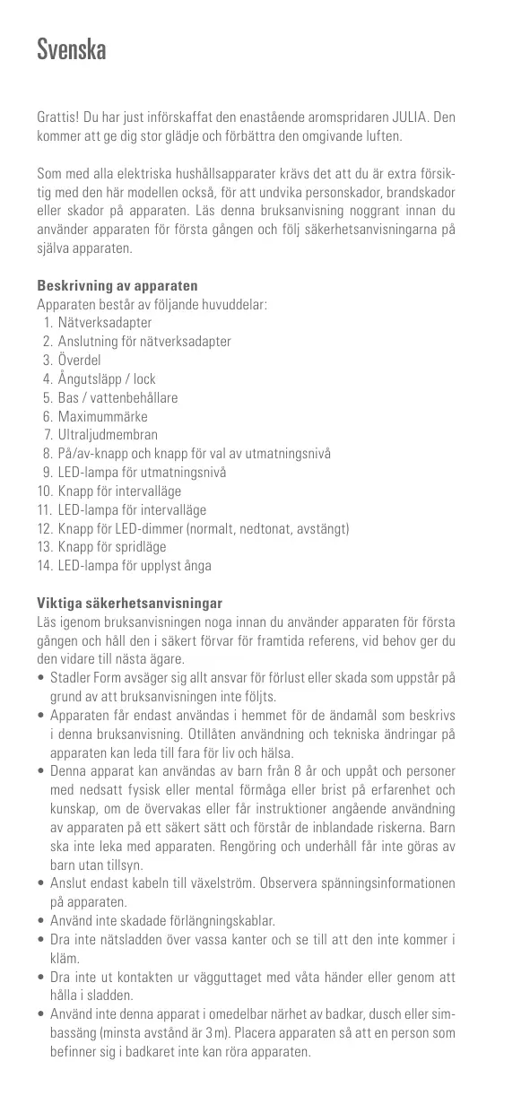 Grattis! Du har just inforskaffat den enastende aromspridaren JULIA. Denkommen att ge dig stor gladje och forbätra den omgivande luften.
