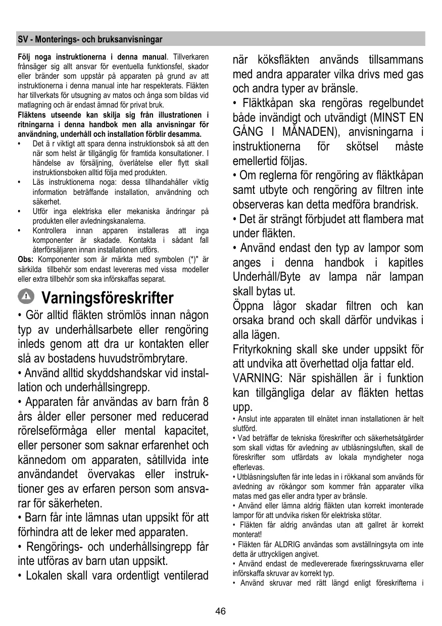 + Om reglerna für rengüring av fläktkäpan samt utbyte och rengôüring av filtren inte observeras kan detta medfôra brandrisk. + Det är strängt forbjudet att flambera mat under fläkten.