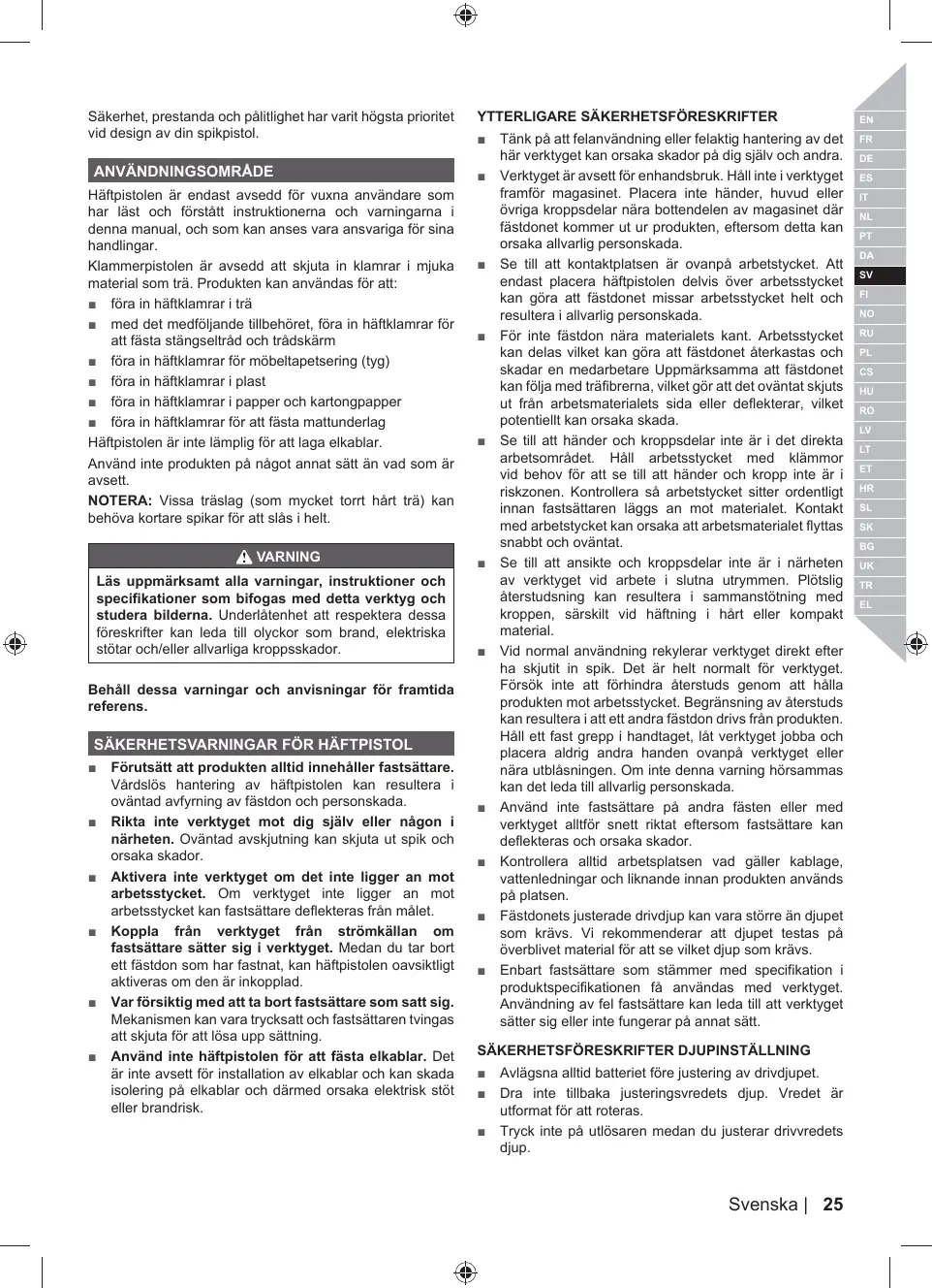 YTTERLIGARE SÂKERHETSFÜRESKRIFTER Tänk pâ att felanvändning eller felaktig hantering av det här verktyget kan orsaka skador pà dig själv och andra. Verktyget är avsett fôr enhandsbruk. Häll inte i verktyget framfôr magasinet. Placera inte händer, huvud eller ôvriga kroppsdelar nära bottendelen av magasinet där fästdonet kommer ut ur produkten, eftersom detta kan orsaka allvarlig personskada.