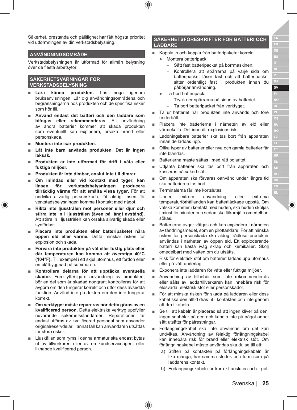 = Apprenez à connaître le produit. Lisez avec attention le manuel d'utilisation. Prenez connaissance des applications et des limitations de l'appareil ainsi que des risques potentiels spécifiques qui lui sont attachés. Utilisez uniquement la batterie et le chargeur fournis ou recommandés. Toute tentative d'utilisation d'un autre bloc de batterie endommagera le produit et serait susceptible de provoquer une explosion, un incendie, ou des blessures. Ne démontez pas le produit. Ne laissez aucun enfant utiliser le produit Ce n'est pas un jouet. Ce produit n'est pas conçu pour fonctionner dans des conditions humides ou mouillées. Ce produit n’est pas variable ; ne le connectez pas à des variateurs. Si le verre de la lampe de travail est enveloppé ou placé en contact avec un tissu, il est susceptible de produire suffisamment de chaleur pour faire fondre le tissu. Pour éviter toute blessure grave, ne laissez jamais le verre de la lampe de travail entrer en contact avec quoi que ce soit. Ne dirigez pas le faisceau de lumière sur les personnes et les animaux et ne regardez pas dans le faisceau vous-même (même à distance). Regarder le faisceau peut entraîner des lésions graves voire la perte de la vision. Ne posez pas le produit ou le bloc de batterie à proximité d'un feu ou d’une source de chaleur. Vous réduirez ainsi les risques d'explosion et de blessures. Ne stockez pas le produit dans un endroit humide ou mouillé, ou dans un endroit dont la température est susceptible d'atteindre ou de dépasser 40°C. Par exemple, dans une remise extérieure, un véhicule ou un bâtiment en tôle pendant l'été. Vérifiez qu'aucune pièce n'est endommagée. Avant toute utilisation prolongée du produit, une pièce endommagée doit être examinée prudemment afin de déterminer si elle va fonctionner correctement et comme prévu. N'utilisez pas le produit s’il ne fonctionne pas correctement. =_ Faites réparer votre outil par du personnel qualifié. Cet outil électrique est conforme aux normes légales de sécurité. Les réparations ne doivent être effectuées que par du personnel qualifié utilisant des pièces de rechange d'origine; dans le cas contraire, l'utilisateur s'exposerait à de graves dangers. = La source lumineuse contenue dans ce luminaire doit être remplacée uniquement pas le fabricant ou un de
