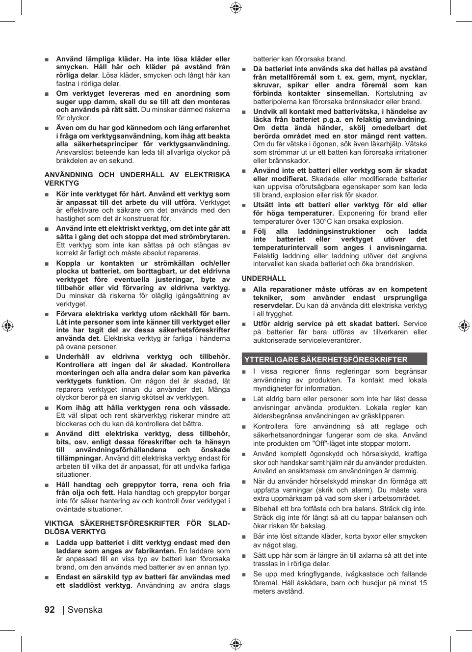 = Suivre toutes les instructions de charge et ne pas charger le bloc de batteries ou l'outil fonctionnant sur batteries hors de la plage de températures spécifiée dans les instructions. Un chargement incorrect ou à des températures hors de la plage spécifiée de températures peut endommager la batterie et augmenter le risque de feu.
