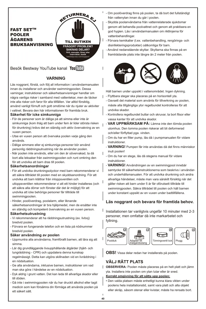 BRUKSANVISNING FAST SET BESTWAY