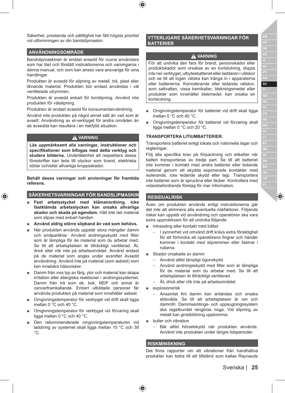 = Coincement ou entrée en contact avec la bande de ponçage en mouvement — Lors du fonctionnement inversé, des précautions supplémentaires doivent être prises pour éviter que les doigts et les mains de l'utilisateur ne viennent en contact avec la bande abrasive ou ne se coincent dans les galets. = Blessures dues à la poussière — Portez en permanence une protection oculaire. Portez un masque de protection respiratoire contenant des filtres adaptés aux matériaux travaillés. Assurez une ventilation correcte à l'espace de travail. Ne mangez pas, Ne buvez pas, et ne fumez pas dans l'espace de travail = Risque d'explosion — La poussière fine accumulée est susceptible de