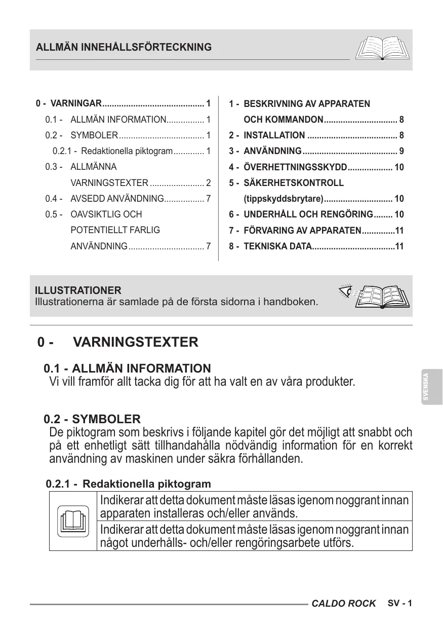 1- BESKRIVNING AV APPARATEN OCH KOMMANDON. 2- INSTALLATION 3- ANVANDNING.. 4- ÔVERHETTNINGSSKYDD.... 5- SÂKERHETSKONTROLL (tippskyddsbrytare).…. 6- UNDERHALL OCH RENGÔRING. 7- FÜRVARING AV APPARATEN.. 8- TEKNISKA DATA.