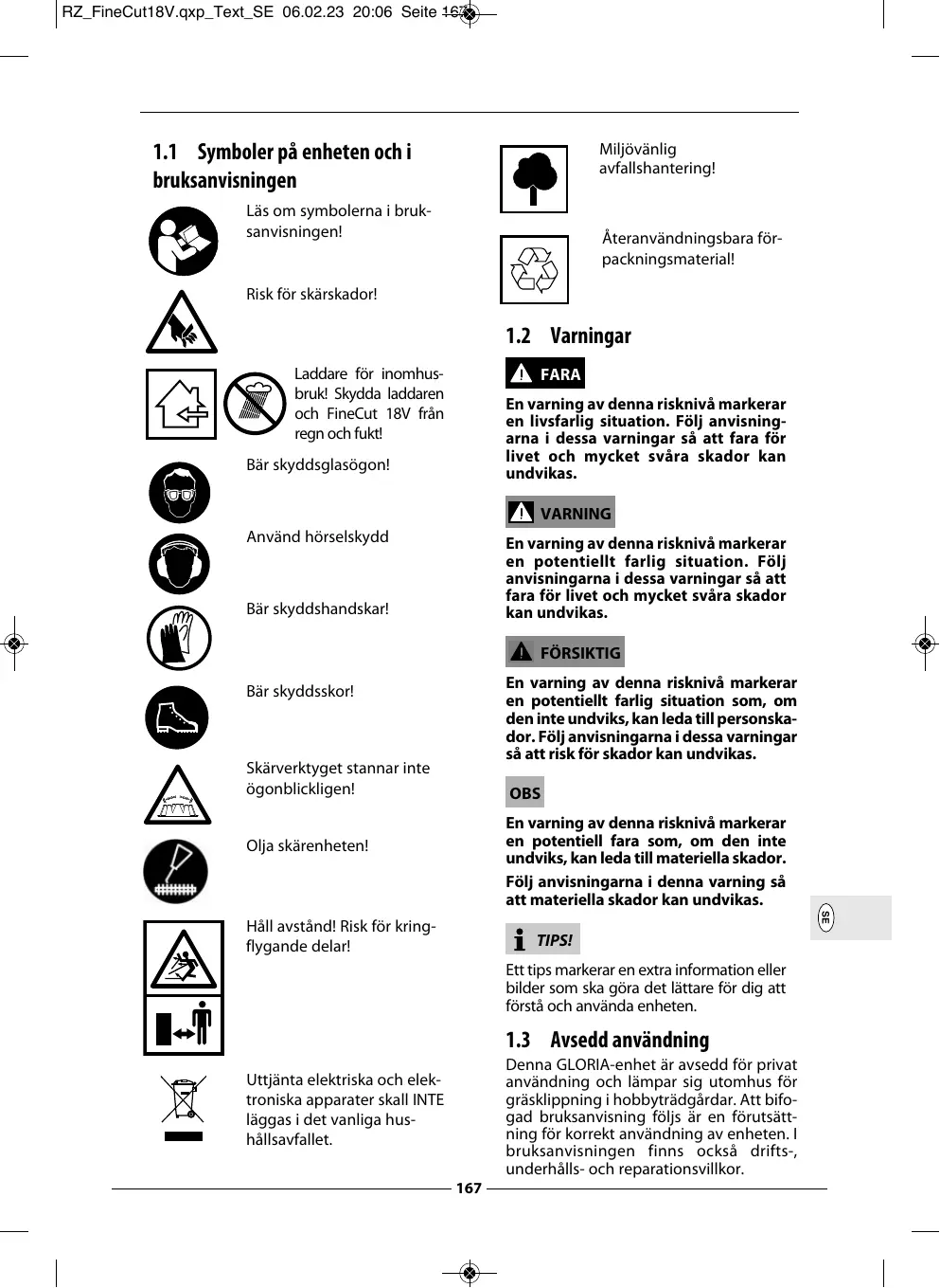 BRUKSANVISNING FINECUT GLORIA