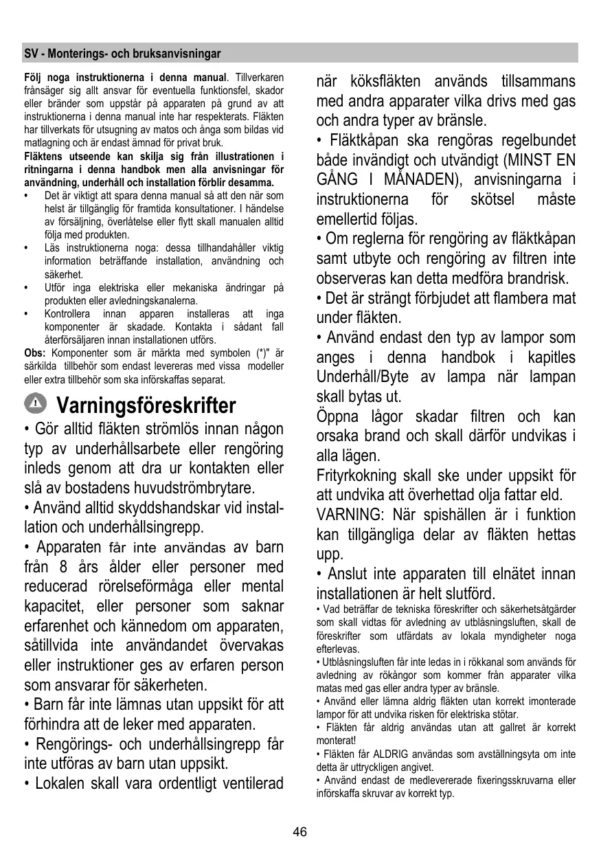 + La hotte ne doit JAMAIS être utilisée comme une surface d'appui, sauf indication expresse.