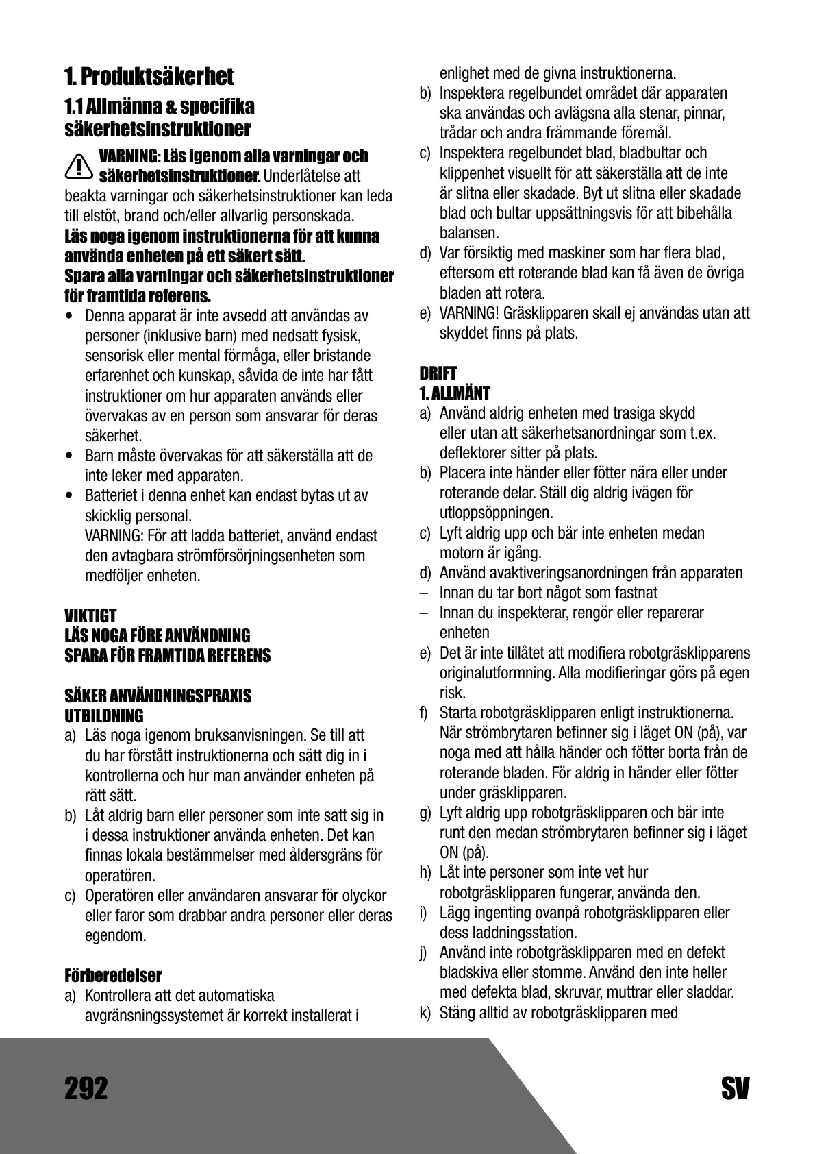 h) Ne laissez en aucun cas la tondeuse à une personne non familiarisée avec l'appareil et son mode d'utilisation.