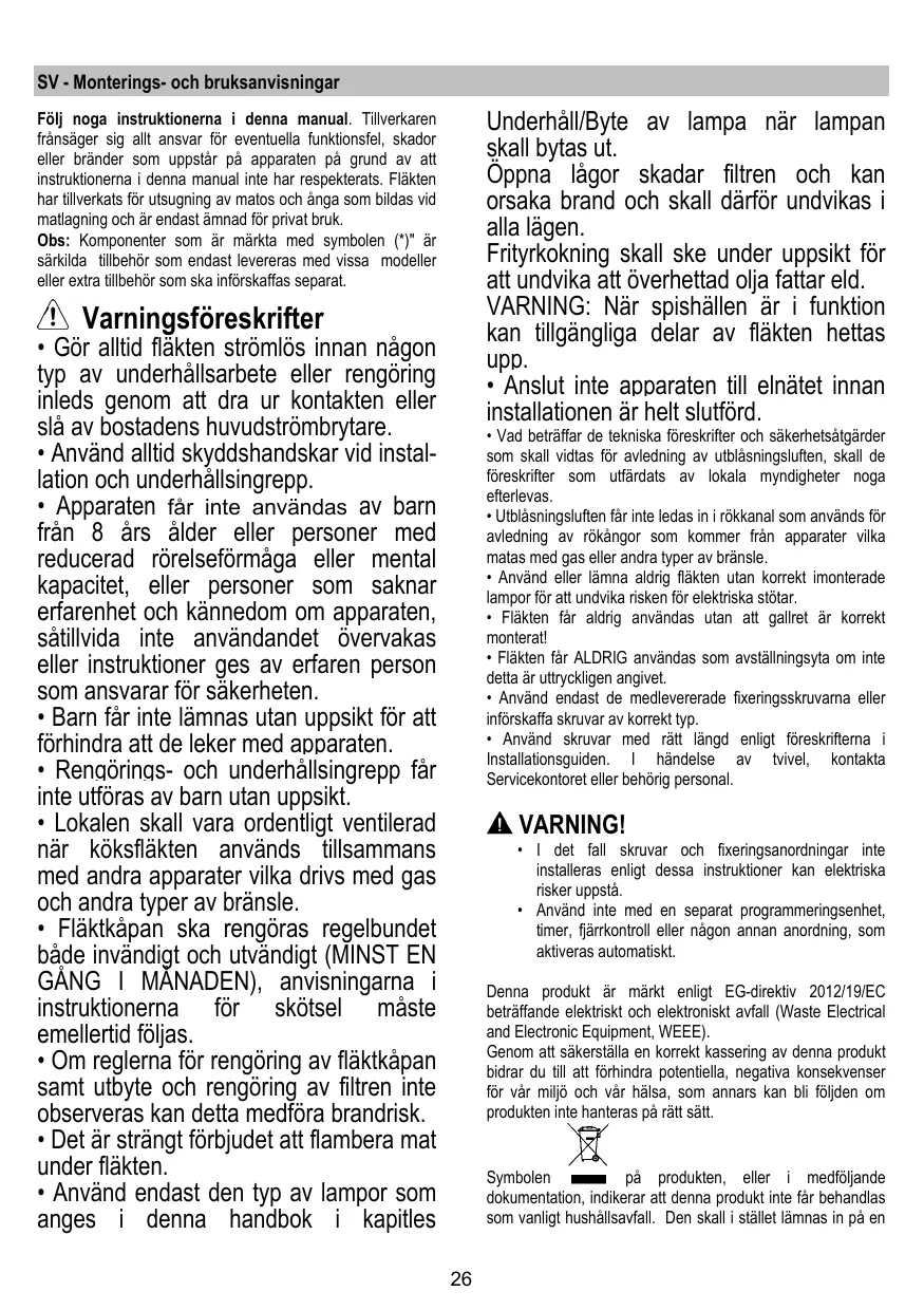 + Ne pas utiliser ou laisser la hotte sans les lampes correctement montées, car un éventuel risque de choc