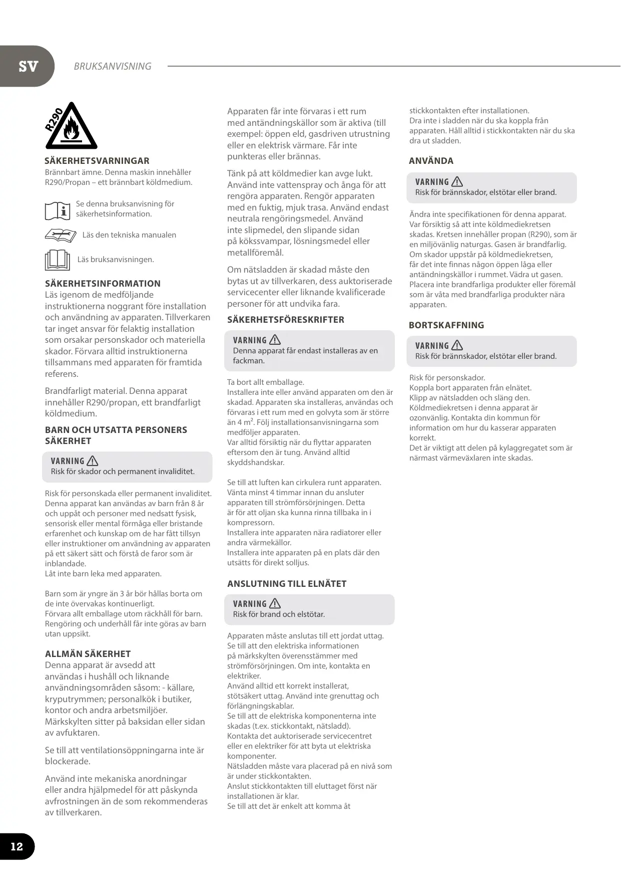 Ne pas utiliser de dispositifs mécaniques ou d'autres moyens pour accélérer le processus de dégivrage, autres que ceux recommandés par le fabricant. L'appareil ne doit pas être entreposé dans une pièce dans laquelle des sources inflammables fonctionnent en permanence (flammes nues, appareil à gaz, radiateur électrique, etc). Ne pas percer ni brûler. Tenir compte du fait que les réfrigérants n'ont pas forcément d'odeur. Ne pas utiliser de pulvérisation d'eau ni de vapeur pour nettoyer l'appareil. Nettoyer l'appareil à l'aide d'un chiffon doux humide. Utiliser uniquement des détergents neutres.