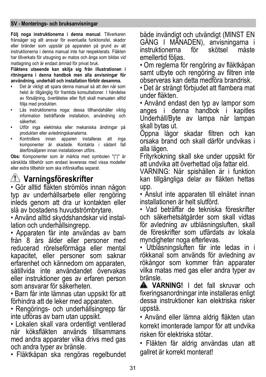+ Ne pas utiliser ou laisser la hotte sans les lampes correctement montées, car un éventuel risque de choc électrique est possible.