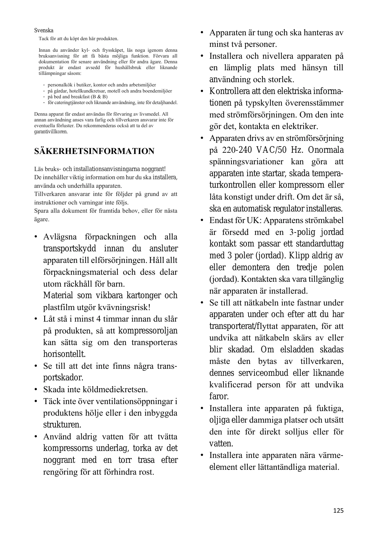 N'installez pas l'appareil à proximité de sources de chaleur ou de matériaux inflammables POUR les appareils équipés d'un compartiment congélateur : en cas de panne de courant, n’ouvrez pas le couvercle. Les aliments congelés ne devraient pas être affectés si la panne dure moins que les heures indiquées sur l'étiquette signalétique (temps de montée en température). Si la panne dure plus longtemps, alors il convient de vérifier les aliments et de les manger immédiatement ou bien de les cuire et de les congeler à nouveau.