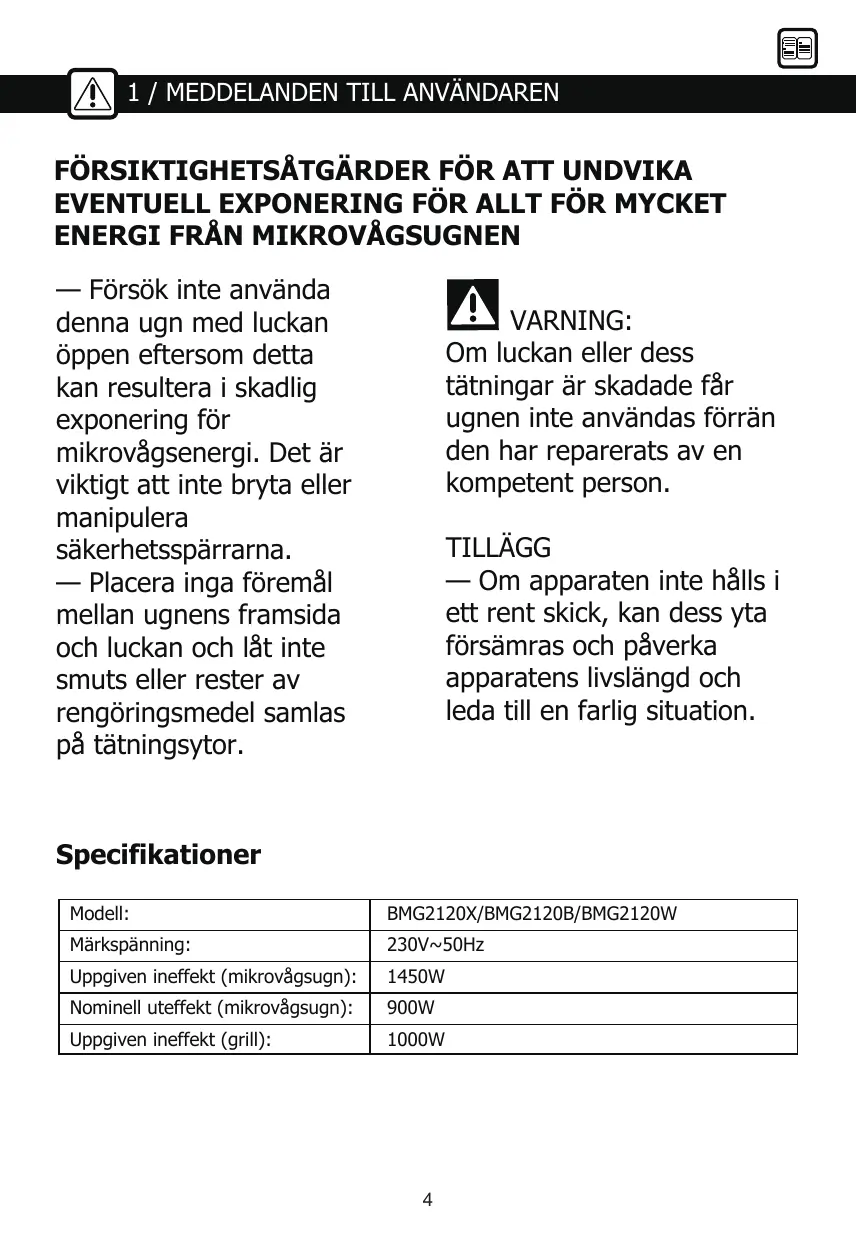 1 / MEDDELANDEN TILL ANVANDAREN FÔRSIKTIGHETSÂTGÂRDER FÔR ATT UNDVIKA EVENTUELL EXPONERING FÔR ALLT FÜR MYCKET ENERGI FRÂN MIKROVÂGSUGNEN