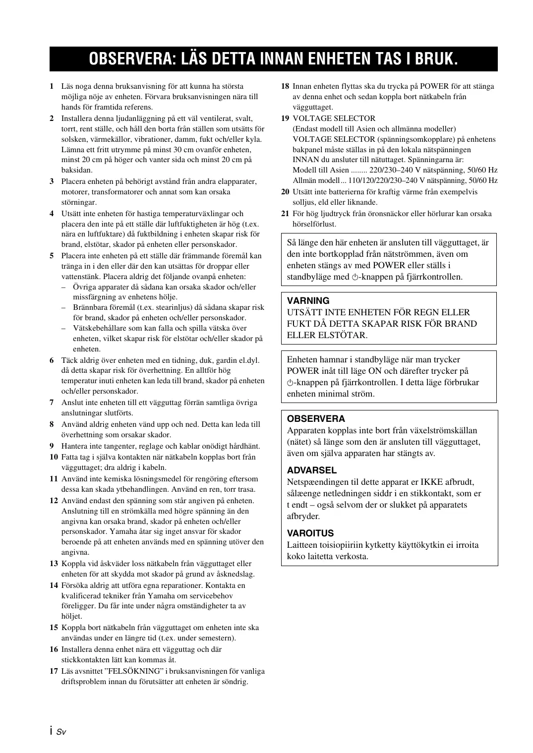 OBSERVERA: LÄS DETTA INNAN ENHETEN TAS I BRUK. 1 Läs noga denna bruksanvisning för att kunna ha största möjliga nöje av enheten. Förvara bruksanvisningen nära till hands för framtida referens. 2 Installera denna ljudanläggning på ett väl ventilerat, svalt, torrt, rent ställe, och håll den borta från ställen som utsätts för solsken, värmekällor, vibrationer, damm, fukt och/eller kyla. Lämna ett fritt utrymme på minst 30 cm ovanför enheten, minst 20 cm på höger och vanter sida och minst 20 cm på baksidan. 3 Placera enheten på behörigt avstånd från andra elapparater, motorer, transformatorer och annat som kan orsaka störningar. 4 Utsätt inte enheten för hastiga temperaturväxlingar och placera den inte på ett ställe där luftfuktigheten är hög (t.ex. nära en luftfuktare) då fuktbildning i enheten skapar risk för brand, elstötar, skador på enheten eller personskador. 5 Placera inte enheten på ett ställe där främmande föremål kan tränga in i den eller där den kan utsättas för droppar eller vattenstänk. Placera aldrig det följande ovanpå enheten: – Övriga apparater då sådana kan orsaka skador och/eller missfärgning av enhetens hölje. – Brännbara föremål (t.ex. stearinljus) då sådana skapar risk för brand, skador på enheten och/eller personskador. – Vätskebehållare som kan falla och spilla vätska över enheten, vilket skapar risk för elstötar och/eller skador på enheten. 6 Täck aldrig över enheten med en tidning, duk, gardin el.dyl. då detta skapar risk för överhettning. En alltför hög temperatur inuti enheten kan leda till brand, skador på enheten och/eller personskador. 7 Anslut inte enheten till ett vägguttag förrän samtliga övriga anslutningar slutförts. 8 Använd aldrig enheten vänd upp och ned. Detta kan leda till överhettning som orsakar skador. 9 Hantera inte tangenter, reglage och kablar onödigt hårdhänt. 10 Fatta tag i själva kontakten när nätkabeln kopplas bort från vägguttaget; dra aldrig i kabeln. 11 Använd inte kemiska lösningsmedel för rengöring eftersom dessa kan skada ytbehandlingen. Använd en ren, torr trasa. 12 Använd endast den spänning som står angiven på enheten. Anslutning till en strömkälla med högre spänning än den angivna kan orsaka brand, skador på enheten och/eller personskador. Yamaha åtar sig inget ansvar för skador beroende på att enheten används med en spänning utöver den angivna. 13 Koppla vid åskväder loss nätkabeln från vägguttaget eller enheten för att skydda mot skador på grund av åsknedslag. 14 Försöka aldrig att utföra egna reparationer. Kontakta en kvalificerad tekniker från Yamaha om servicebehov föreligger. Du får inte under några omständigheter ta av höljet. 15 Koppla bort nätkabeln från vägguttaget om enheten inte ska användas under en längre tid (t.ex. under semestern). 16 Installera denna enhet nära ett vägguttag och där stickkontakten lätt kan kommas åt. 17 Läs avsnittet ”FELSÖKNING” i bruksanvisningen för vanliga driftsproblem innan du förutsätter att enheten är söndrig.