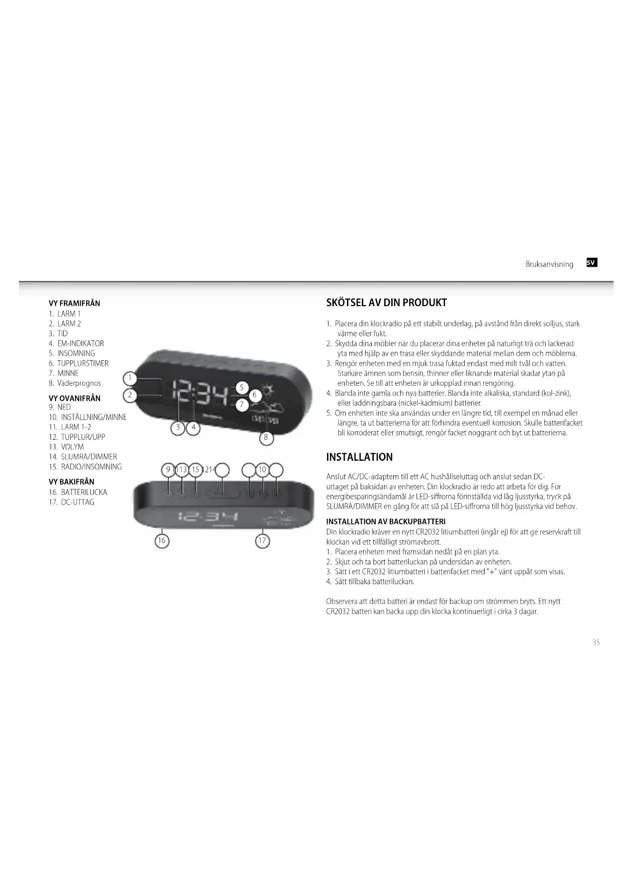 Observera att detta batteri är endast för backup om strömmen bryts. Ett nytt CR2032 batteri kan backa upp din klocka kontinuerligt i cirka 3 dagar.36 Bruksanvisning INSTÄLLNING AV TID, 12/24-TIMMARS TID OCH SLUMRINGSLÄNGD