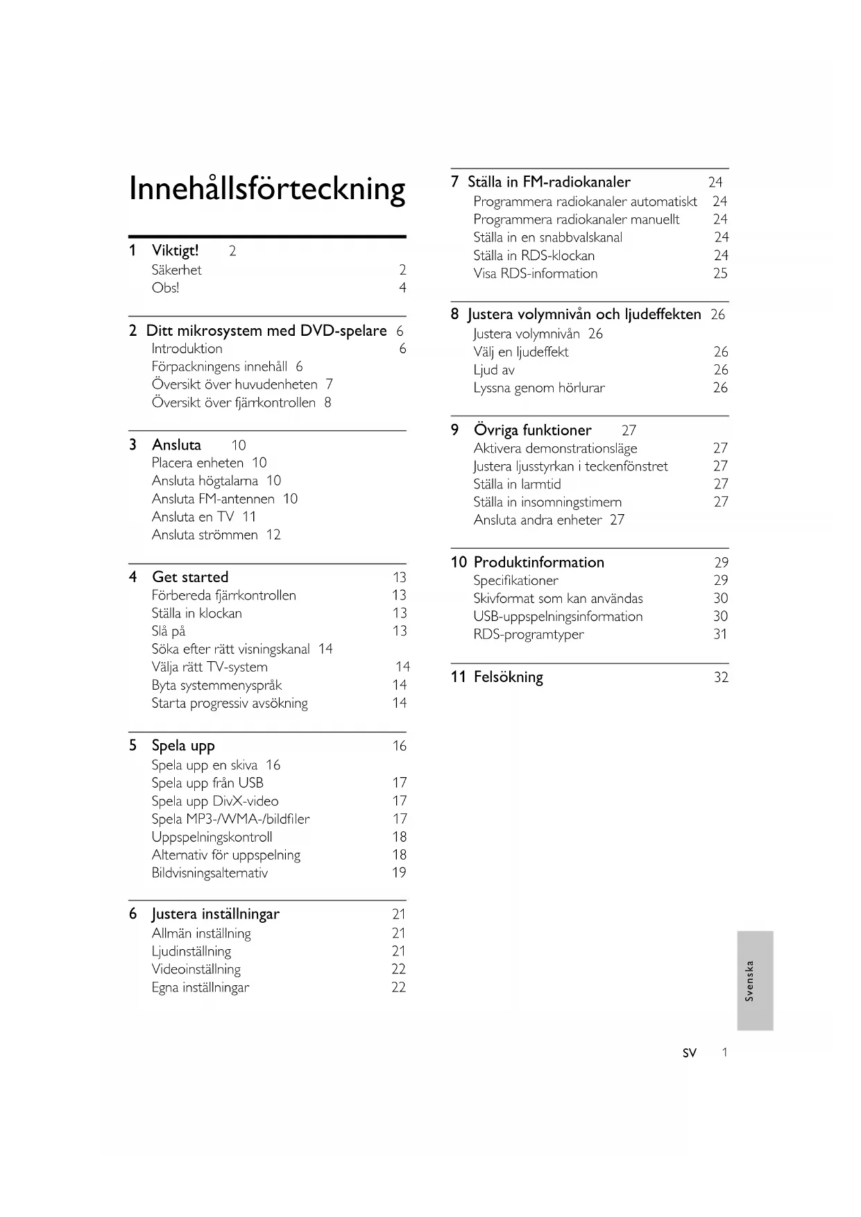 Innehållsförteckning 1 Viktigt! 2 Säkerhet 2 Obs! 4 2 Ditt mikrosystem med DVD-spelare 6 Introduktion 6 Förpackningens innehåll 6 Översikt över huvudenheten 7 Översikt över fjärrkontrollen 8 3 Ansluta 10 Placera enheten 10 Ansluta högtalarna 10 Ansluta FM-antennen 10 Ansluta en TV 11 Ansluta strömmen 12 4 Get started 13 Förbereda fjärrkontrollen 13 Ställa in klockan 13 Slå på 13 Söka efter rätt visningskanal 14 Välja rätt TV-system 14 Byta systemmenyspråk 14 Starta progressiv avsökning 14 5 Spela upp 16 Spela upp en skiva 16 Spela upp från USB 17 Spela upp DivX-video 17 Spela MP3-/WMA-/bildfi ler 17 Uppspelningskontroll 18 Alternativ för uppspelning 18 Bildvisningsalternativ 19 6 Justera inställningar 21 Allmän inställning 21 Ljudinställning 21 Videoinställning 22 Egna inställningar 22 7 Ställa in FM-radiokanaler 24 Programmera radiokanaler automatiskt 24 Programmera radiokanaler manuellt 24 Ställa in en snabbvalskanal 24 Ställa in RDS-klockan 24 Visa RDS-information 25 8 Justera volymnivån och ljudeffekten 26 Justera volymnivån 26 Välj en ljudeffekt 26 Ljud av 26 Lyssna genom hörlurar 26 9 Övriga funktioner 27 Aktivera demonstrationsläge 27 Justera ljusstyrkan i teckenfönstret 27 Ställa in larmtid 27 Ställa in insomningstimern 27 Ansluta andra enheter 27 10 Produktinformation 29 Specifi kationer 29 Skivformat som kan användas 30 USB-uppspelningsinformation 30 RDS-programtyper 31 11 Felsökning 322 f Rengör endast med torr trasa. g Blockera inte ventilationsöppningar. Installera apparaten i enlighet med tillverkarens instruktioner. h Installera den inte i närheten av någon värmekälla, som element, varmluftsintag, spis eller annan utrustning som avger värme (inklusive förstärkare). i Skydda elkabeln så att den inte blir trampad på eller kommer i kläm, särskilt intill kontakter, extrauttag och precis vid apparathöljet. j Använd endast kringutrustning och tillbehör som är godkända av leverantören. k Använd endast apparaten tillsammans med den vagn eller det ställ, stativ, fäste eller bord som anges av leverantören eller som säljs tillsammans med apparaten. När du använder vagnen bör du vara försiktig när du fl yttar den, så att den inte välter och det uppstår skador på apparaten. l Dra ur kontakten till apparaten vid åskväder samt när den inte ska användas på länge. m Överlåt allt underhåll till kvalifi cerad servicepersonal. Service är nödvändig när apparaten har skadats på något sätt, till exempel om en elkabel eller kontakt är skadad, vätska eller främmande föremål har kommit in i apparaten, apparaten har utsatts för regn eller fukt, inte fungerar som den ska eller om den har fallit i golvet. 1 Viktigt! Säkerhet Lär dig de här säkerhetssymbolerna Blixten anger att det fi nns oisolerat material i enheten som kan ge en elektrisk stöt. För allas säkerhet bör du inte ta bort det skyddande höljet på produkten. Utropstecknet betyder att det fi nns funktioner som du bör läsa mer om i den handbok som medföljer, för att undvika problem vid användning och underhåll. VARNING! För att minska risken för brand och elektriska stötar bör du inte utsätta apparaten för regn eller fukt och du bör inte heller placera kärl med vatten, exempelvis blomvaser, ovanpå apparaten. VARNING! För att minska risken för elektriska stötar bör du se till att sätta i kontakten på rätt sätt och trycka in den ända in i uttaget. Viktiga säkerhetsinstruktioner a Läs de här instruktionerna. b Behåll de här instruktionerna. c Läs och ta till dig varningstexten. d Följ samtliga instruktioner. e Använd inte apparaten i närheten av vatten. SV3 Om nätkontakten innehåller en säkring ska den vara på 5 A. Om du använder en kontakt utan säkring ska säkringen på fördelningstavlan inte vara på mer än 5 A. Obs! Kassera den borttagna kontakten för att på så sätt undvika att någon sätter i den i ett 13 A-uttag någon annanstans och får en elektrisk stöt. Ansluta kontakten Trådarna i nätsladden har följande färgkoder: blå = neutral (N), brun = spänningsförande (L). Det är inte säkert att de här färgerna överensstämmer med färgmarkeringarna på uttagen på kontakten. Gör därför så här: Anslut den blå tråden till det uttag som är • svart eller markerat med bokstaven N. Anslut den bruna tråden till det • uttag som är rött eller markerat med bokstaven L. Anslut inte någon av trådarna till • jorduttaget, som är grönt (grönt och gult) eller markerat med bokstaven E (eller