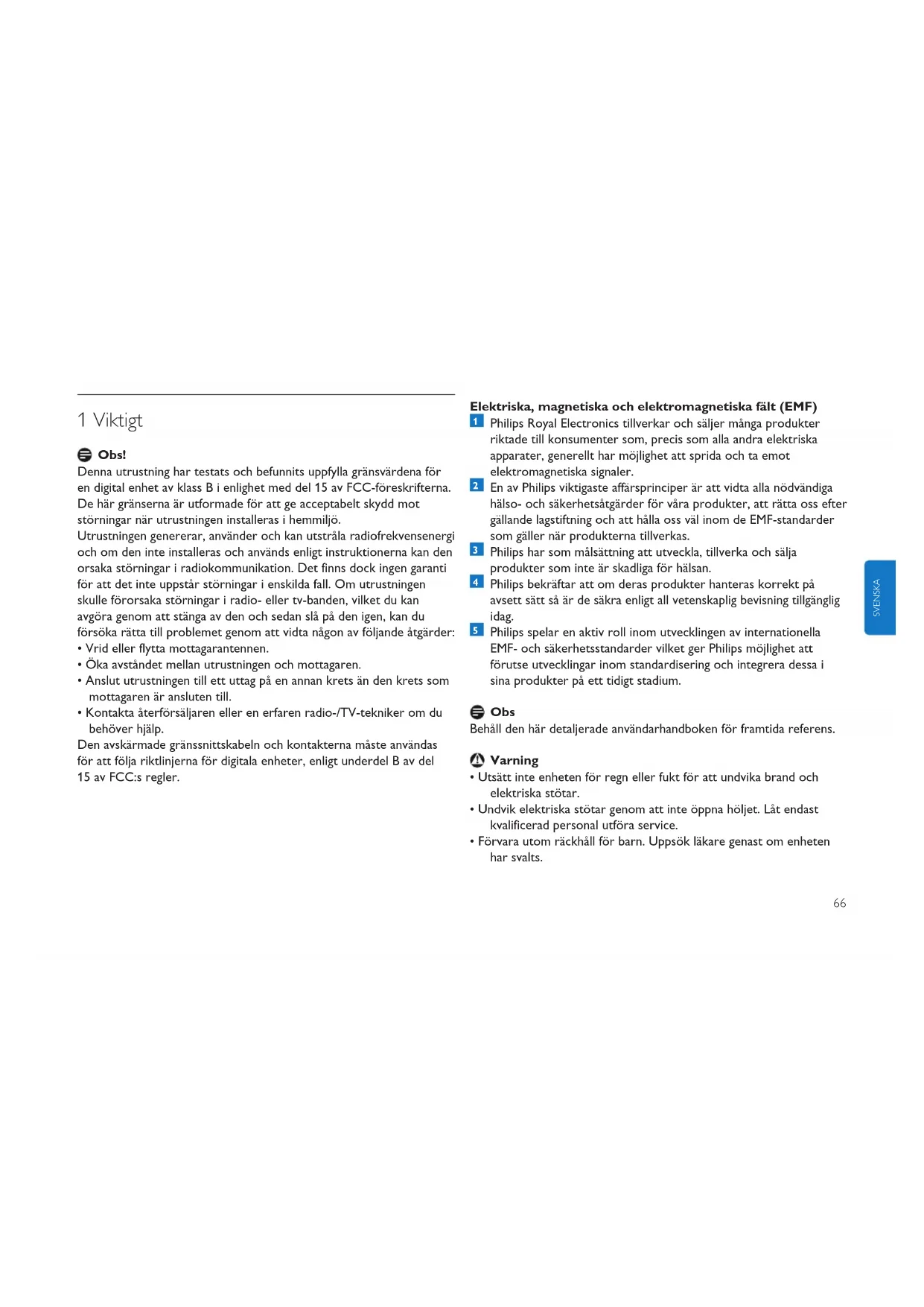 - Kontakta återförsäljaren eller en erfaren radio-/TV-tekniker om du behöver hjälp. Den avskärmade gränssnittskabeln och kontakterna måste användas för att följa riktlinjerna för digitala enheter, enligt underdel B av del 15 av FCC:s regler. Elektriska, magnetiska och elektromagnetiska fält (EMF) Philips Royal Electronics tillverkar och säljer många produkter riktade till konsumenter som, precis som alla andra elektriska apparater, generellt har möjlighet att sprida och ta emot elektromagnetiska signaler. En av Philips viktigaste affärsprinciper är att vidta alla nödvändiga hälso- och säkerhetsåtgärder för våra produkter, att rätta oss efter gällande lagstiftning och att hålla oss väl inom de EMF-standarder som gäller när produkterna tillverkas. Philips har som målsättning att utveckla, tillverka och sälja produkter som inte är skadliga för hälsan. Philips bekräftar att om deras produkter hanteras korrekt på avsett sätt så är de säkra enligt all vetenskaplig bevisning tillgänglig idag. Philips spelar en aktiv roll inom utvecklingen av internationella EMF- och säkerhetsstandarder vilket ger Philips möjlighet att förutse utvecklingar inom standardisering och integrera dessa i sina produkter på ett tidigt stadium. Obs Behåll den här detaljerade användarhandboken för framtida referens. Varning
