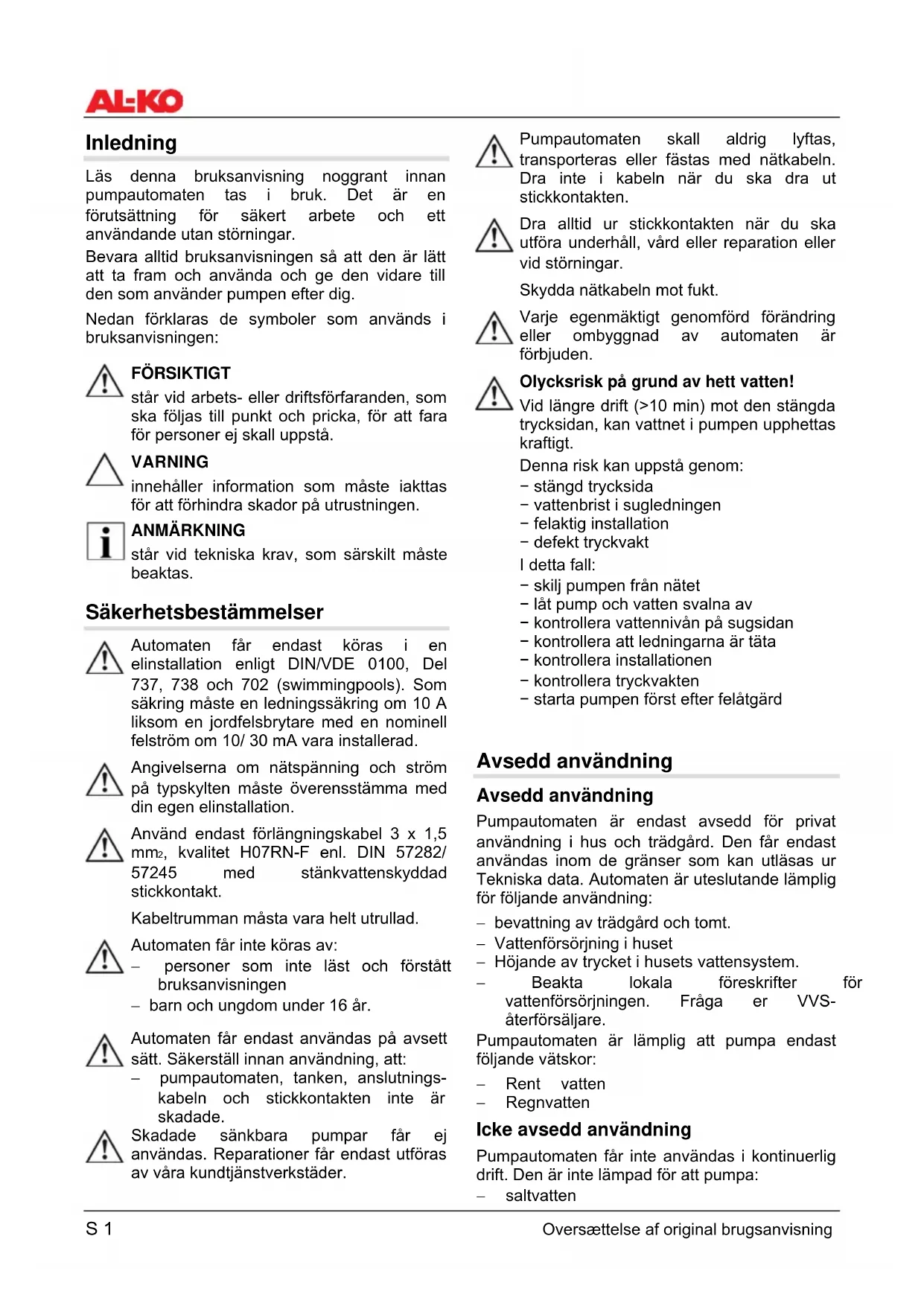 2, kvalitet H07RN-F enl. DIN 57282/ 57245 med stänkvattenskyddad stickkontakt. Kabeltrumman måsta vara helt utrullad. Automaten får inte köras av: − personer som inte läst och förstått bruksanvisningen − barn och ungdom under 16 år. Automaten får endast användas på avsett sätt. Säkerställ innan användning, att: − pumpautomaten, tanken, anslutnings- kabeln och stickkontakten inte är skadade. Skadade sänkbara pumpar får ej användas. Reparationer får endast utföras av våra kundtjänstverkstäder. Pumpautomaten skall aldrig lyftas, transporteras eller fästas med nätkabeln. Dra inte i kabeln när du ska dra ut stickkontakten. Dra alltid ur stickkontakten när du ska utföra underhåll, vård eller reparation eller vid störningar. Skydda nätkabeln mot fukt. Varje egenmäktigt genomförd förändring eller ombyggnad av automaten är förbjuden. Olycksrisk på grund av hett vatten! Vid längre drift (>10 min) mot den stängda trycksidan, kan vattnet i pumpen upphettas kraftigt. Denna risk kan uppstå genom: − stängd trycksida − vattenbrist i sugledningen − felaktig installation − defekt tryckvakt I detta fall: − skilj pumpen från nätet − låt pump och vatten svalna av − kontrollera vattennivån på sugsidan − kontrollera att ledningarna är täta − kontrollera installationen − kontrollera tryckvakten − starta pumpen först efter felåtgärd Avsedd användning Avsedd användning Pumpautomaten är endast avsedd för privat användning i hus och trädgård. Den får endast användas inom de gränser som kan utläsas ur Tekniska data. Automaten är uteslutande lämplig för följande användning: − bevattning av trädgård och tomt. − Vattenförsörjning i huset − Höjande av trycket i husets vattensystem. − Beakta lokala föreskrifter för vattenförsörjningen. Fråga er VVS- återförsäljare. Pumpautomaten är lämplig att pumpa endast följande vätskor: − Rent vatten − Regnvatten Icke avsedd användning Pumpautomaten får inte användas i kontinuerlig drift. Den är inte lämpad för att pumpa: − saltvatten S 1 Oversættelse af original brugsanvisning− livsmedel − smutsvatten med textil eller papperspartiklar − aggressiva vätskor, kemikalier − frätande, brännbara, explosiva eller förgasande vätskor − vätskor som är varmare än 35 °C − sandhaltigt vatten och smärglande ämnen. Apparatbeskrivning Oversættelse af original brugsanvisning S 2 Pumpautomat/tillbehör (bild A och B) 1 Pumpchassi 2 Påfyllningsskruv 3 Pumputgång/anslutning, tryckledning 4 Chassi, motor 5 Ventil 6 Tank 7 Manometer 8 Nätkabel 9 Avtappningsskruv (pumpkammare) 10 Tryckströmställare 11 Utjämningsledning 12 Avtappningsskruv (filterkammare) 13 Förfilter (tillbehör) 14 Genomskinligt lock, filter 15 Vinkelnippel 16 Packning 17 Förbindningsnippel 18 Packningsring 19 Tryckledning (tillbehör) 20 AL-KO-sugsats (tillbehör) 21 Packning till filter 22 Filter 23 Backslagsventil 24 Packning 25 Packningsring (genomskinligt lock, filter) 26 Packning Leveransomfattning Pumpautomaten är utrustat med tryckströmställare, manometer samt nätkabel med jordad stickkontakt. Till leveransomfattningen hör också en filternyckel (se bild C). Tillbehören ingår inte i leveransomfattningen. Funktion Automatiskt. Pumpen slår på och av beroende på trycket (se Tekniska data). Pumpautomaten suger vattnet via pumpingången (13) och vidarebefordrar det till tanken (6). När avslagstrycket uppnåtts (tanken är full) slår pumpen automatiskt av. Efter ett tryckfall om c:a 2,0 bar (vatten tappas av) slår pumpen automatiskt på och fyller tanken eller vidarebefordrar vattnet till kran eller annan förbrukare. I det senare fallet fylls tanken först då förbrukningen av vattnet upphört. Termoskydd Pumpautomaten har ett termoskydd, som slår av pumpen om den överhettas. Efter en tid för avkylning (c:a 15-20 minuter) slås pumpen automatiskt på igen. Apparatuppställning, första användning Innan automaten tas i drift skall mebranförtrycket kontrolleras vid ventilen (5). Trycket måste uppgå till c:a 1,5 bar. Ändra vid behov trycket (se ”Kontrollera membranförtrycket”).