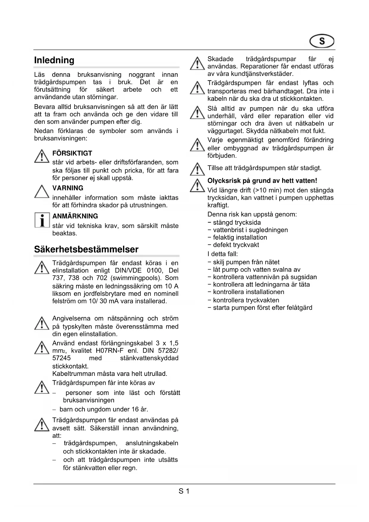 FÖRSIKTIGT står vid arbets- eller driftsförfaranden, som ska följas till punkt och pricka, för att fara för personer ej skall uppstå. VARNING innehåller information som måste iakttas för att förhindra skador på utrustningen. ANMÄRKNING står vid tekniska krav, som särskilt måste beaktas. Säkerhetsbestämmelser Trädgårdspumpen får endast köras i en elinstallation enligt DIN/VDE 0100, Del 737, 738 och 702 (swimmingpools). Som säkring måste en ledningssäkring om 10 A liksom en jordfelsbrytare med en nominell felström om 10/ 30 mA vara installerad. Angivelserna om nätspänning och ström på typskylten måste överensstämma med din egen elinstallation. Använd endast förlängningskabel 3 x 1,5