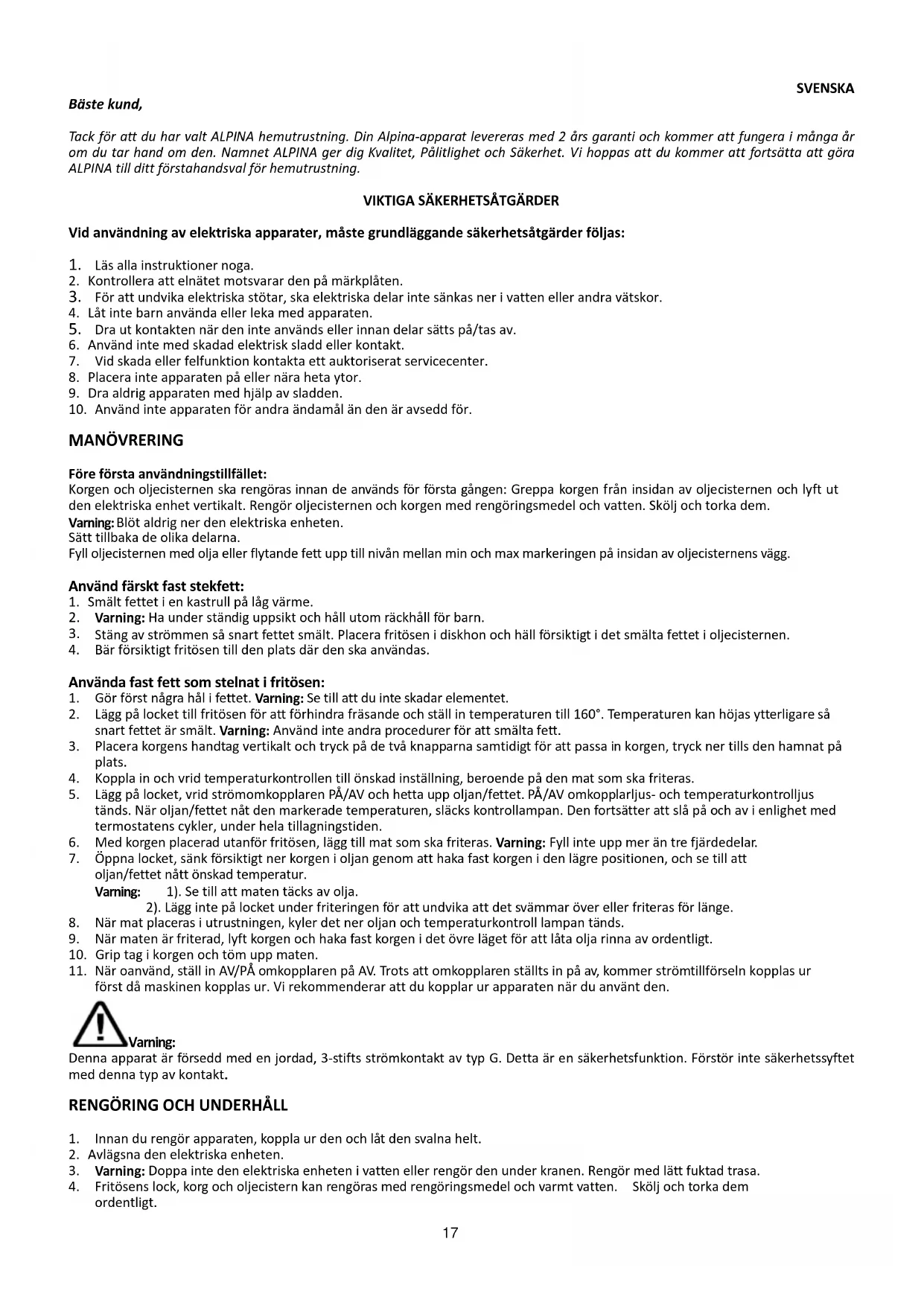Tack for att du har valt ALPINA hemutrusting. Din Alpina-apparat levereras med 2 ars garanti ochkommen att fungera i manga ar om du tar hand om den. Namnet ALPINA ger dig Kvalitet, Paliitlighet och Sakerhet. Vi hoppas att du kommer att fortsaatta att gora ALPINA till ditt forstahandsval for hemutrusting.