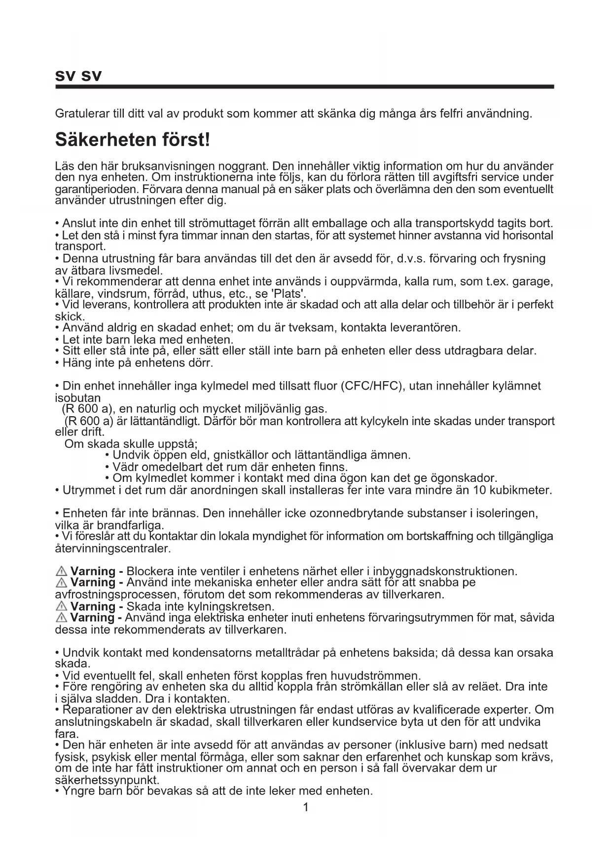 • Denna utrustning får bara användas till det den är avsedd för, d.v.s. förvaring och frysning