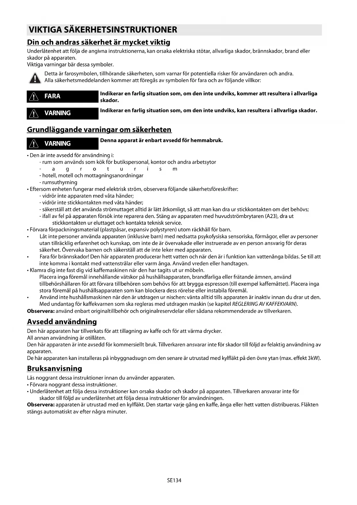 Detta är farosymbolen, tillhörande säkerheten, som varnar för potentiella risker för användaren och andra. Alla säkerhetsmeddelanden kommer att föregås av symbolen för fara och av följande villkor: FARA Indikerar en farlig situation som, om den inte undviks, kommer att resultera i allvarliga skador. VARNING Indikerar en farlig situation som, om den inte undviks, kan resultera i allvarliga skador. VARNING Denna apparat är enbart avsedd för hemmabruk.SE135 Kontroll av transporten Efter att ha avlägsnat emballaget, säkerställ att apparaten är hel och att alla tillbehör finns med. Använd inte apparaten vid tydliga skador. Kontakta teknisk service. Installation av apparaten Anslutning av apparaten Anslut enbart apparaten till ett uttag installerat på ett fackmannamässigt sätt med en minimum effekt på 10 A utrustad med effektiv jordning. Vid inkompatibilitet mellan eluttaget och apparatens stickkontakt låt byta ut eluttaget mot ett annat av lämplig typ av kvalificerad personal. För att uppfylla direktiven om säkerhet under installationen är det nödvändigt att använda en allpolig brytare med ett minsta avstånd mellan kontakterna på 3 mm. Använd inte grenuttag eller förlängningssladdar. Apparaten uppfyller följande EG-direktiv: