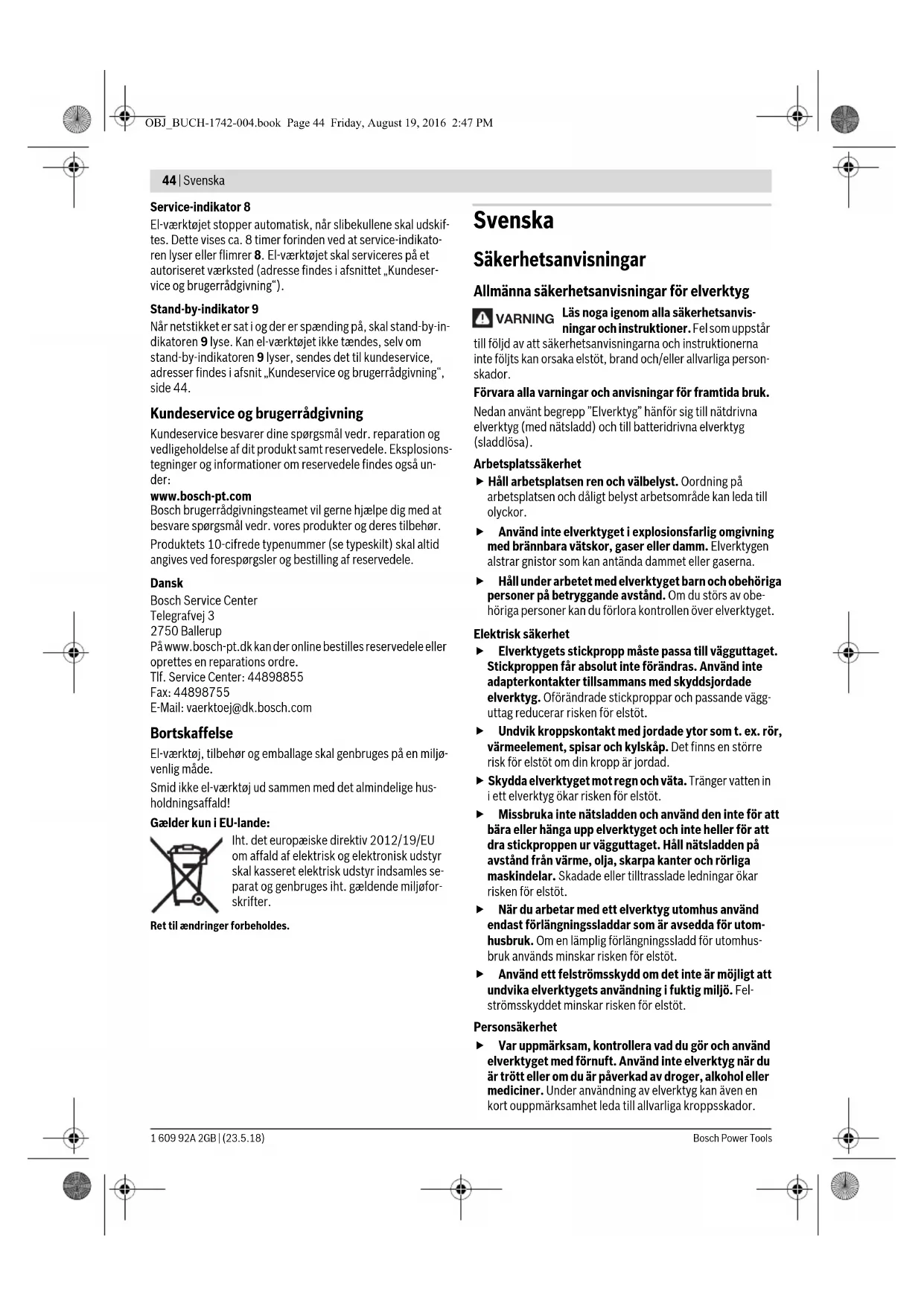 Vægt svarer til EPTA-Procedure 01:2014 kg 6,8 Beskyttelsesklasse /II Angivelserne gælder for en nominel spænding [U] på 230 V. Disse angi- velser kan variere ved afvigende spændinger og i landespecifikke udfø- relser. Position til hammerboring Hvis indsatsværktøjet ikke drejer med det samme, når det tændes, skal el-værktøjet kø- re langsomt, til indsatsværktøjet drejer med. OBJ_BUCH-1742-004.book Page 42 Friday, August 19, 2016 2:47 PMDansk | 43 Bosch Power Tools 1 609 92A 2GB | (23.5.18) I positionen „mejsling“ øges det slagtal, der er blevet indstil- let med hjulet 7, automatisk ved tænding; derved arbejder el-værktøjet med øget kapacitet under mejslearbejdet. Tænde og slukke for borearbejde For at spare på energien bør du kun tænde for el-værktøjet, når du bruger det. –Til ibrugtagning af el-værktøjet tryk på start-stop-kontak- ten 5 og hold den nede. – El-værktøjet slukkes ved at slippe start-stop-kontakten 5. Tænde og slukke for mejslearbejde For at spare på energien bør du kun tænde for el-værktøjet, når du bruger det. –Tryk til ibrugtagning af el-værktøjet på start-stop-kontak- ten 5 foroven (I), til den fastlåses. – El-værktøjet slukkes ved at trykke start-stop-kontakten 5 forneden (0) og slippe den. Ved lave temperaturer når el-værktøjet først efter et vist styk- ke tid den fulde hammerkapacitet/slagkapacitet. Omdrejningstal/slagtal indstilles Reguleringselektronikken muliggør en trinløs indstilling af dreje- og slagtallet, så det passer til det materiale, der skal be- arbejdes. Konstantelektronikken holder det indstillede dreje- og slagtal mellem tomkørsel og belastning næsten konstant. Når netstikket sættes i stikdåsen eller efter strømsvigt, ind- stiller reguleringselektronikken automatisk det højeste om- drejnings- og slagtal. Dette forhindrer, at der på grund af en lav forindstilling af stillehjulet 7 ikke arbejdes med optimal ka- pacitet. – Vælg slagtallet med stillehjulet 7, så det passer til det ma- teriale, der skal bearbejdes. Angivelserne i efterfølgende tabel er anbefalede værdier. Overbelastningskobling Sidder indsatsværktøjet i klemme, afbrydes rotatio- nen. I den forbindelse opstår store kræfter. Hold derfor altid el-værktøjet sikkert med begge hænder og sørg for at stå fast under arbejdet. Sluk for el-værktøjet og løsne indsatsværktøjet, hvis el-værktøjet blokerer. Der opstår store reaktionsmo- menter, hvis maskinen tændes med et blokeret bore- værktøj. Ændring af mejselstilling (Vario-Lock) Du kan fastlåse mejslen i 12 stillinger. Dette gør det muligt al- tid at indtage den optimale arbejdsposition. – Anbring mejslen i værktøjsholderen. – Drej rotationsstopknappen 3 til positionen „Vario-Lock“ (se „Indstil funktion“, side 42). – Drej værktøjsholderen i den ønskede mejselstilling. – Drej rotationsstopknappen 3 til positionen „Mejsling“. Der- ved låses værktøjsholderen. Rotationsstopknappen 3 skal ved mejsling altid stå i stillingen „Mejsling“. Arbejdsvejledning Træk stikket ud af stikkontakten, før der udføres arbej- de på el-værktøjet. Vibrationsdæmpning Den integrerede vibrationsdæmpninng reducerer optræden- de vibrationer. Softgrebet gør det nemmere at holde rigtigt fast på værktøjet. Dette gør el-værktøjet mere handy og nemmere at styre. Vedligeholdelse og service Vedligeholdelse og rengøring Træk stikket ud af stikkontakten, før der udføres arbej- de på el-værktøjet. El-værktøj og el-værktøjets ventilationsåbninger skal altid holdes rene for at sikre et godt og sikkert arbejde. En beskadiget støvbeskyttelseskappe skal skiftes med det samme. Det anbefales, at få dette gjort af en servi- cetekniker. Hvis det er nødvendigt at erstatte tilslutningsledningen, skal dette arbejde udføres af Bosch eller på et autoriseret service- værksted for Bosch el-værktøj for at undgå farer. Position Vario-Lock til indstilling af mejselpo- sitionen Position til mejsling Anvendelse Position Stillehjulet Bearbejdning af puds/lette byggematerialer Afløsning af fliser Bearbejdning af teglsten Bearbejdning af beton OBJ_BUCH-1742-004.book Page 43 Friday, August 19, 2016 2:47 PM44 | Svenska 1 609 92A 2GB | (23.5.18) Bosch Power Tools Service-indikator 8 El-værktøjet stopper automatisk, når slibekullene skal udskif- tes. Dette vises ca. 8 timer forinden ved at service-indikato- ren lyser eller flimrer 8. El-værktøjet skal serviceres på et autoriseret værksted (adresse findes i afsnittet „Kundeser- vice og brugerrådgivning“). Stand-by-indikator 9 Når netstikket er sat i og der er spænding på, skal stand-by-in- dikatoren 9 lyse. Kan el-værktøjet ikke tændes, selv om stand-by-indikatoren 9 lyser, sendes det til kundeservice, adresser findes i afsnit „Kundeservice og brugerrådgivning“, side 44. Kundeservice og brugerrådgivning Kundeservice besvarer dine spørgsmål vedr. reparation og vedligeholdelse af dit produkt samt reservedele. Eksplosions- tegninger og informationer om reservedele findes også un- der: www.bosch-pt.com Bosch brugerrådgivningsteamet vil gerne hjælpe dig med at besvare spørgsmål vedr. vores produkter og deres tilbehør. Produktets 10-cifrede typenummer (se typeskilt) skal altid angives ved forespørgsler og bestilling af reservedele. Dansk Bosch Service Center Telegrafvej 3 2750 Ballerup På www.bosch-pt.dk kan der online bestilles reservedele eller oprettes en reparations ordre. Tlf. Service Center: 44898855 Fax: 44898755 E-Mail: vaerktoej@dk.bosch.com Bortskaffelse El-værktøj, tilbehør og emballage skal genbruges på en miljø- venlig måde. Smid ikke el-værktøj ud sammen med det almindelige hus- holdningsaffald! Gælder kun i EU-lande: Iht. det europæiske direktiv 2012/19/EU om affald af elektrisk og elektronisk udstyr skal kasseret elektrisk udstyr indsamles se- parat og genbruges iht. gældende miljøfor- skrifter. Ret til ændringer forbeholdes. Svenska Säkerhe