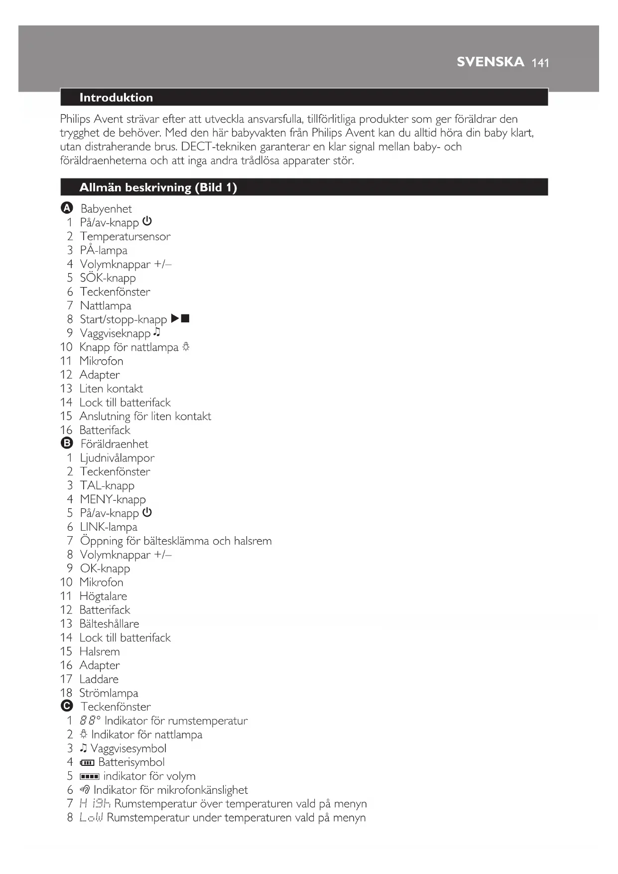 Om adaptern till babyenheten skadas ska den alltid ersättas med en adapter av originaltyp för