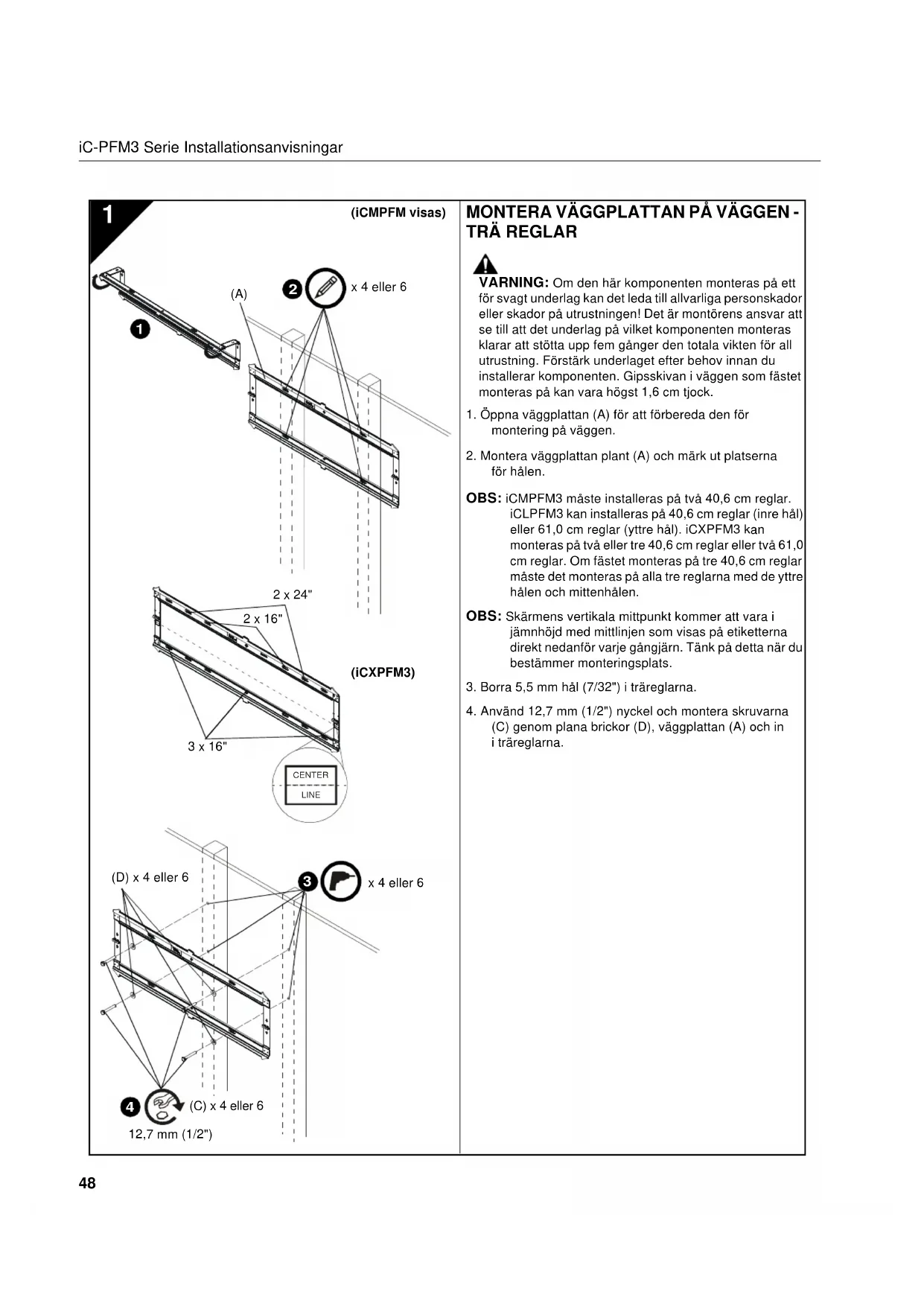 VÄGGPLATTAN VARNING: Om vikten överstigs kan det orsaka allvarlig personskada eller skada på utrustningen! Det är montörens ansvar att kontrollera att den kombinerade vikten för alla komponenterna som monterats inte överstiger 56,7 kg (125 lbs ) för iCMPFM3 och iCLPFM3 eller 79,4 kg (175 lbs) för iCXPFM3. Användning av produkter som överstiger den angivna maxvikten kan leda till att fästet och dess tillbehör faller ner, vilket kan orsaka skada. VARNING: Skärmar kan vara mycket tunga! Kontrollera att skärmen kan lyftas säkert och manövreras efter behov för att monteras på väggplattan. Om förebyggande åtgärder inte vidtagits kan detta leda till allvarliga personskador eller skador på utrustningen! VARNING: Gränssnittsfästena måste hängas på motsatt sida av mittklacken på väggplattan!