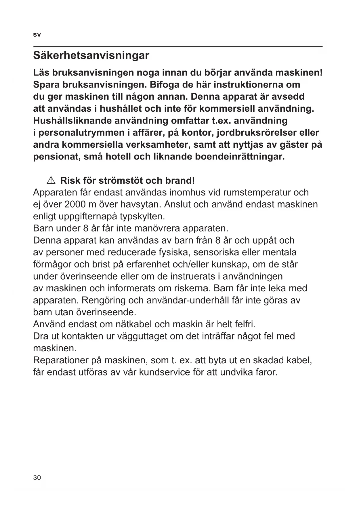 Säkerhetsanvisningar Läs bruksanvisningen noga innan du börjar använda maskinen! Spara bruksanvisningen. Bifoga de här instruktionerna om du ger maskinen till någon annan. Denna apparat är avsedd att användas i hushållet och inte för kommersiell användning. Hushållsliknande användning omfattar t.ex. användning i personalutrymmen i affärer, på kontor, jordbruksrörelser eller andra kommersiella verksamheter, samt att nyttjas av gäster på pensionat, små hotell och liknande boendeinrättningar. A Risk för strömstöt och brand! Apparaten får endast användas inomhus vid rumstemperatur och ej över 2000 m över havsytan. Anslut och använd endast maskinen enligt uppgifternapå typskylten. Barn under 8 år får inte manövrera apparaten. Denna apparat kan användas av barn från 8 år och uppåt och av personer med reducerade fysiska, sensoriska eller mentala förmågor och brist på erfarenhet och/eller kunskap, om de står under överinseende eller om de instruerats i användningen av maskinen och informerats om riskerna. Barn får inte leka med apparaten. Rengöring och användar-underhåll får inte göras av barn utan överinseende. Använd endast om nätkabel och maskin är helt felfri. Dra ut kontakten ur vägguttaget om det inträffar något fel med maskinen. Reparationer på maskinen, som t. ex. att byta ut en skadad kabel, får endast utföras av vår kundservice för att undvika faror.31