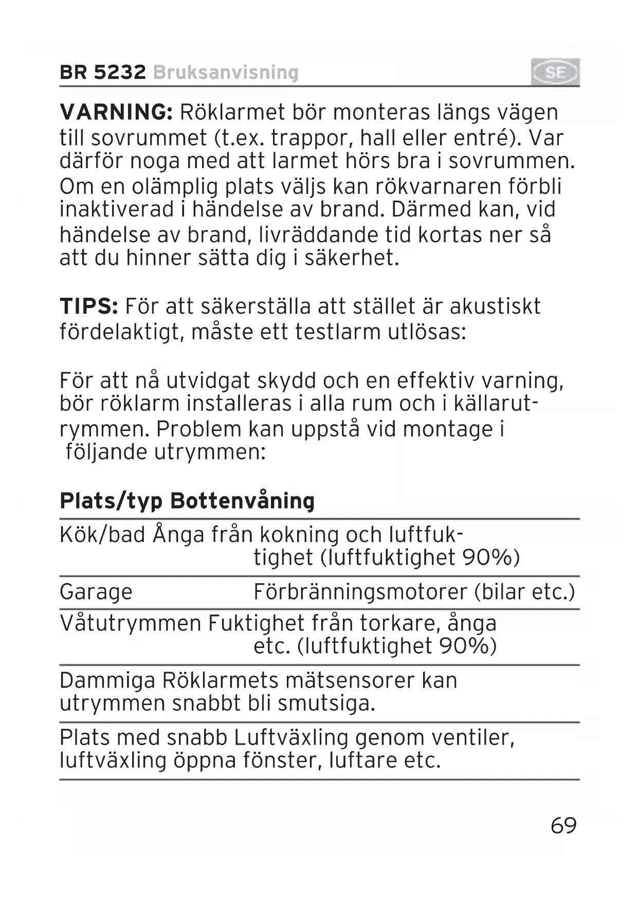 BR 5232 Bruksanvisning 052109 Rauchmelder BR 5232 02.06.2009 19:19 Uhr68 Bruksanvisning BR 5232 Röklarm för optimalt skydd Röklarm för minimiskydd 052109 Rauchmelder BR 5232 02.06.2009 19:19 Uhr69 BR 5232 Bruksanvisning VARNING: Röklarmet bör monteras längs vägen till sovrummet (t.ex. trappor, hall eller entré). Var därför noga med att larmet hörs bra i sovrummen. Om en olämplig plats väljs kan rökvarnaren förbli inaktiverad i händelse av brand. Därmed kan, vid händelse av brand, livräddande tid kortas ner så att du hinner sätta dig i säkerhet. TIPS: För att säkerställa att stället är akustiskt fördelaktigt, måste ett testlarm utlösas: För att nå utvidgat skydd och en effektiv varning, bör röklarm installeras i alla rum och i källarut- rymmen. Problem kan uppstå vid montage i följande utrymmen: Plats/typ Bottenvåning Kök/bad Ånga från kokning och luftfuk- tighet (luftfuktighet 90%) Garage Förbränningsmotorer (bilar etc.) Våtutrymmen Fuktighet från torkare, ånga etc. (luftfuktighet 90%) Dammiga Röklarmets mätsensorer kan utrymmen snabbt bli smutsiga. Plats med snabb Luftväxling genom ventiler, luftväxling öppna fönster, luftare etc. 052109 Rauchmelder BR 5232 02.06.2009 19:19 UhrUtrymmen med Utrymmen med under 0°C eller extrema över 40°C temperaturer Utrymmen med Röklarmets mätsensorer kan hög snabbt bli smutsiga. insektsförekomst Rökrum Röklarmet kan inte skilja på cigarett-/piprök och brandrök. I rummen finns vissa punkter där montering bör övervägas. Plats Beskrivning Takmontage Montera rökvarnaren på ett centralt ställe. VIKTIGT: Områden utan luftväxling bör undvikas, t.ex. i närheten av fönsterbrädor, förhängen, möbler etc. 30 cm avstånd bör hållas. Rök- varnaren bör också sitta minst 30 cm från hörn och väggar. Detta hämmar rökens rörelse och röklarmet larmar först när rökkoncentration är mycket hög. Montage i närheten av ta- klampor (t.ex. halogensystem,