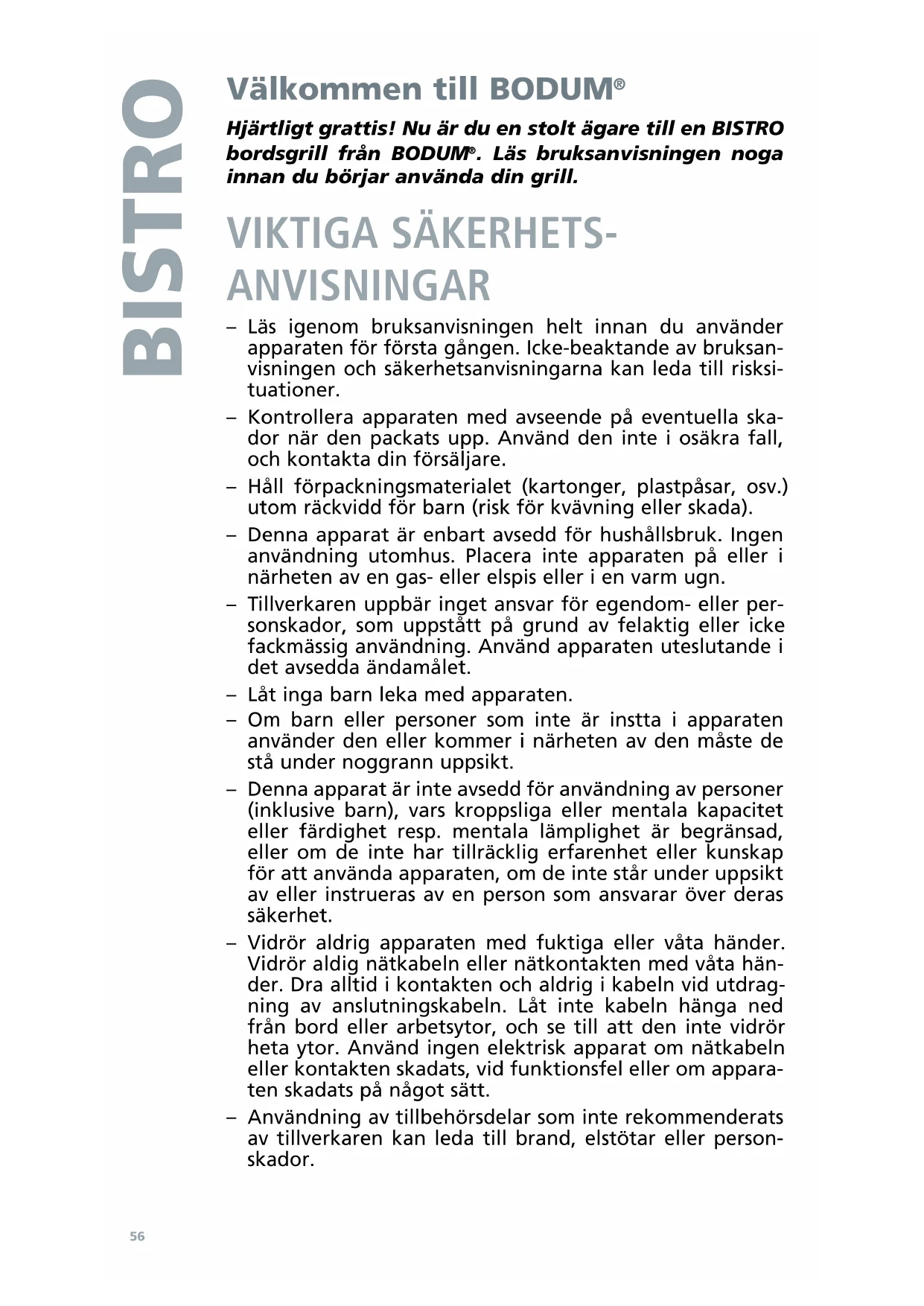 Hjärtigt gratis! Nu är du en stolt ägare till en BISTRO bordsgrill是从BODUM。Läs bruksanvisingen noga innan du böjr använda din grill.