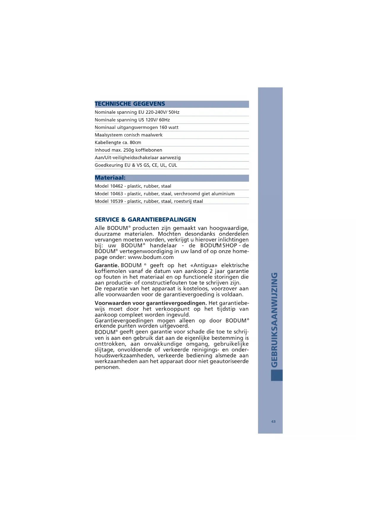 – Läs alla instruktioner innan du använder denna apparat första gången. Om du inte följer instruktioner och säker- hetsråd kan fara uppstå. – När du packat upp apparaten, kontrollera så att den inte är skadad. Om du är tveksam, kontakta säljaren. – Håll packningsmaterialet (kartong, plastpåsar etc.) borta från barn (risk för kvävning eller skada). – Kaffekvarnen är gjord bara för hushållsbruk. Använd den inte utomhus. Ställ aldrig kvarnen på eller nära öppen eld, elelement eller på en varm spis. – Tillverkaren avsäger sig allt ansvar för personskada eller egendomsskada vid olämplig användning. Använd aldrig apparaten för annat ändamål än avsett. – Låt inte barn leka med kaffekvarnen. – Övervaka noga om apparaten används nära barn eller av okända personer. – Kvarnen är inte avsedd att användas av små barn om de inte övervakas noga av en vuxen som kan garantera att den kan användas utan risk. – Rör aldrig kvarnen med fuktiga eller våta händer. Berör inte elkabeln med fuktiga händer. Koppla alltid ur kvarnen genom att hålla i kontakten och inte i sladden. Låt inte sladden hänga över kanten på ett bord eller så den berör varma ytor. Använd inte apparater med trasig sladd eller kontakt eller om apparaten inte fungerar som den ska eller har skadats på något vis. – Användning av extra tillbehör, som inte rekommenderas av tillverkaren, kan resultera i brand, elektrisk chock eller personskador. – Om någon driftstörning eller fel skulle uppstå skall man stänga av kvarnen och inte försöka reparera den själv. Låt endast en av tillverkaren auktoriserad verkstad utföra reparationer på apparaten. Underlåtenhet att följa ovannämnda säkerhetsregler kan påverka säkerheten hos utrustningen. – Försök inte byta sladden på kvarnen eftersom specialverk- tyg behövs. För att garantera forsatt säker drift, låt endast en auktoriserad serviceverkstad godkänd av tillverkaren, byta sladden om det skulle behövas.GEBRUIKSAANWIJZING TECHNISCHE GEGEVENS Nominale spanning EU 220-240V/ 50Hz Nominale spanning US 120V/ 60Hz Nominaal uitgangsvermogen 160 watt Maalsysteem conisch maalwerk Kabellengte ca. 80cm Inhoud max. 250g koffiebonen Aan/Uit-veiligheidsschakelaar aanwezig Goedkeuring EU & VS GS, CE, UL, CUL Materiaal: Model 10462 - plastic, rubber, staal Model 10463 - plastic, rubber, staal, verchroomd giet aluminium Model 10539 - plastic, rubber, staal, roestvrij staal SERVICE & GARANTIEBEPALINGEN Alle BODUM