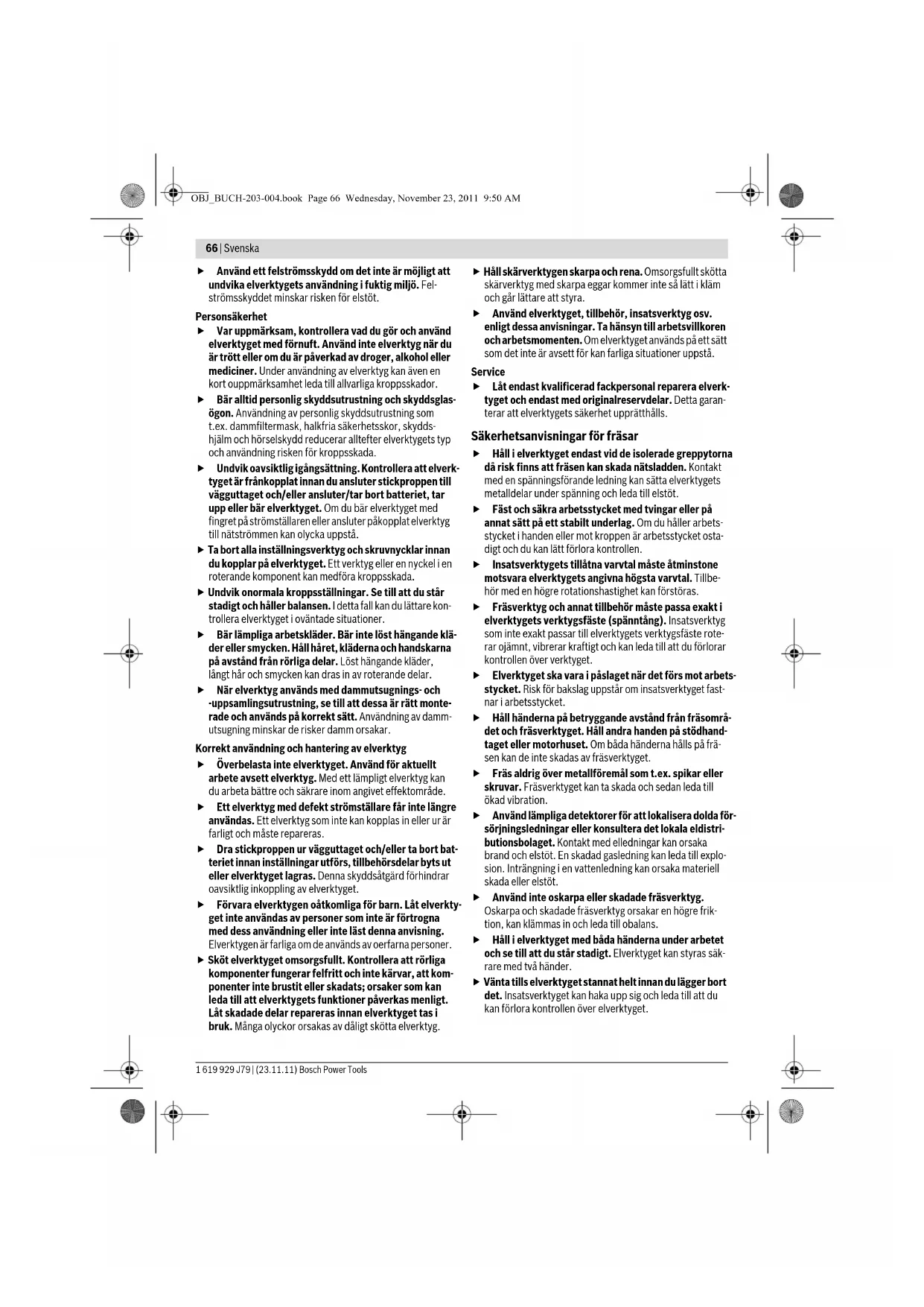 Uppgifterna gäller för en märkspänning på [U] 230 V. Vid avvikande spänning och för utföranden i vissa länder kan uppgifterna variera. Beakta produktnumret på elverktygets typskylt. Handelsbeteckningarna för enskilda elverktyg kan variera. OBJ_BUCH-203-004.book Page 67 Wednesday, November 23, 2011 9:50 AM68 | Svenska 1 619 929 J79 | (23.11.11) Bosch Power Tools Buller-/vibrationsdata Mätvärdena för ljudnivån anges enligt EN 60745. Maskinens A-vägda ljudnivå uppnår i typiska fall: Ljud- trycksnivå 89 dB(A); ljudeffektnivå 100 dB(A). Onoggrann- het K=3 dB. Använd hörselskydd! Totala vibrationsemissionsvärden a